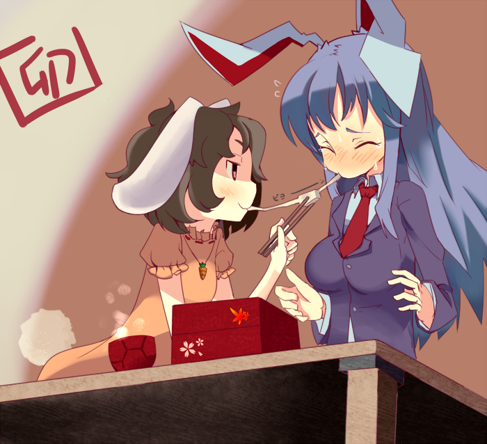 2girls animal_ears black_hair black_jacket blazer blush bowl breasts brown_background carrot_necklace chopsticks closed_eyes closed_mouth collared_shirt commentary_request dress eating floppy_ears food grey_hair holding holding_chopsticks inaba_tewi jacket jewelry long_hair long_sleeves looking_at_another medium_breasts mochi multiple_girls necklace necktie nose_blush ofly_(ofly252) pink_dress rabbit_ears rabbit_girl rabbit_tail red_necktie reisen_udongein_inaba shaded_face shirt short_hair smile table tail touhou upper_body white_shirt