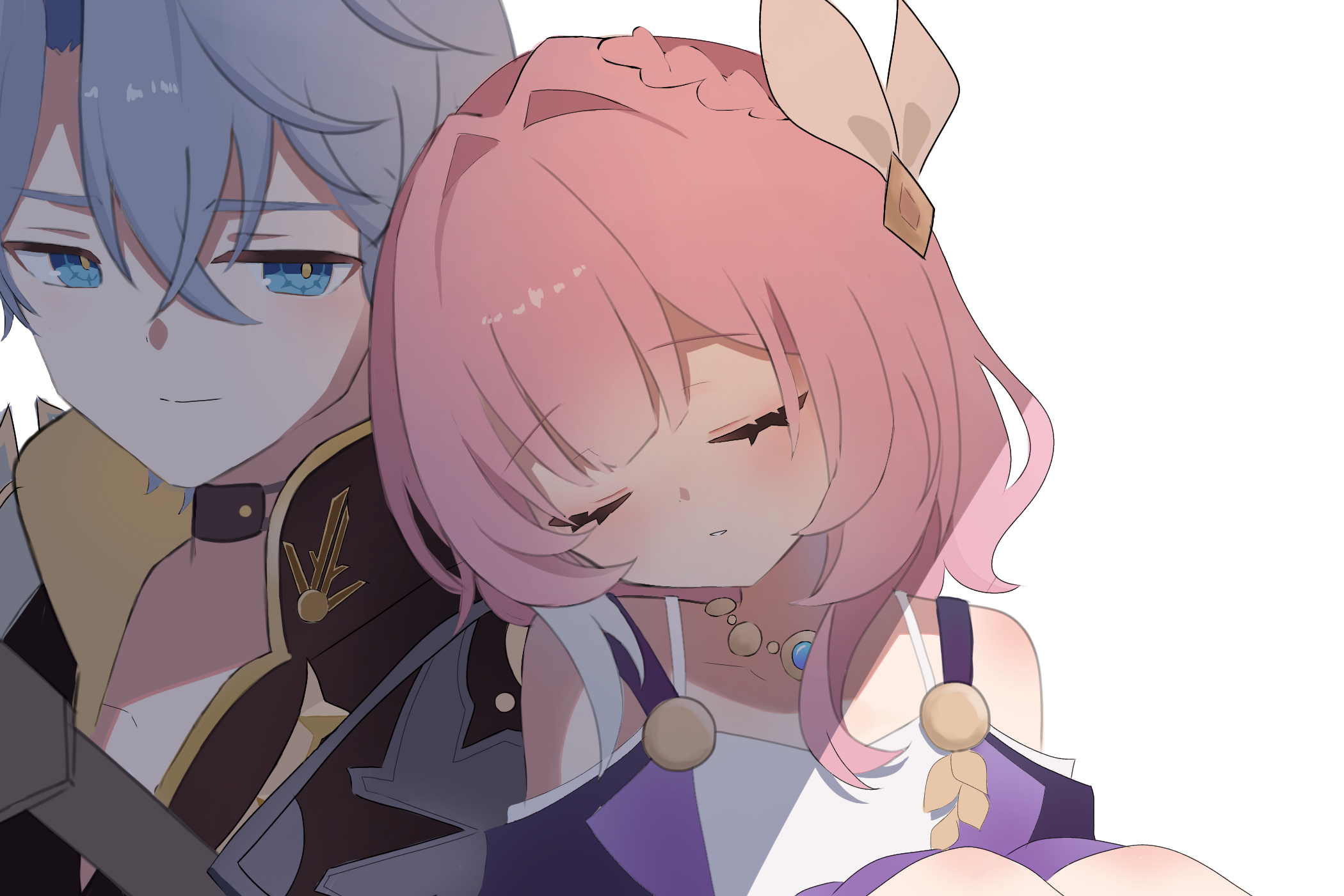 1boy 1girl bare_shoulders blue_eyes breasts coat commentary_request cyrene_(philia093)_(honkai:_star_rail) cyrene_(honkai:_star_rail) dress guratan_13 hair_ornament head_rest highres honkai:_star_rail honkai_(series) jewelry multicolored_hair necklace phainon_(honkai:_star_rail) pink_hair purple_coat short_hair simple_background sleeping small_breasts smile two-tone_hair white_background white_dress white_hair