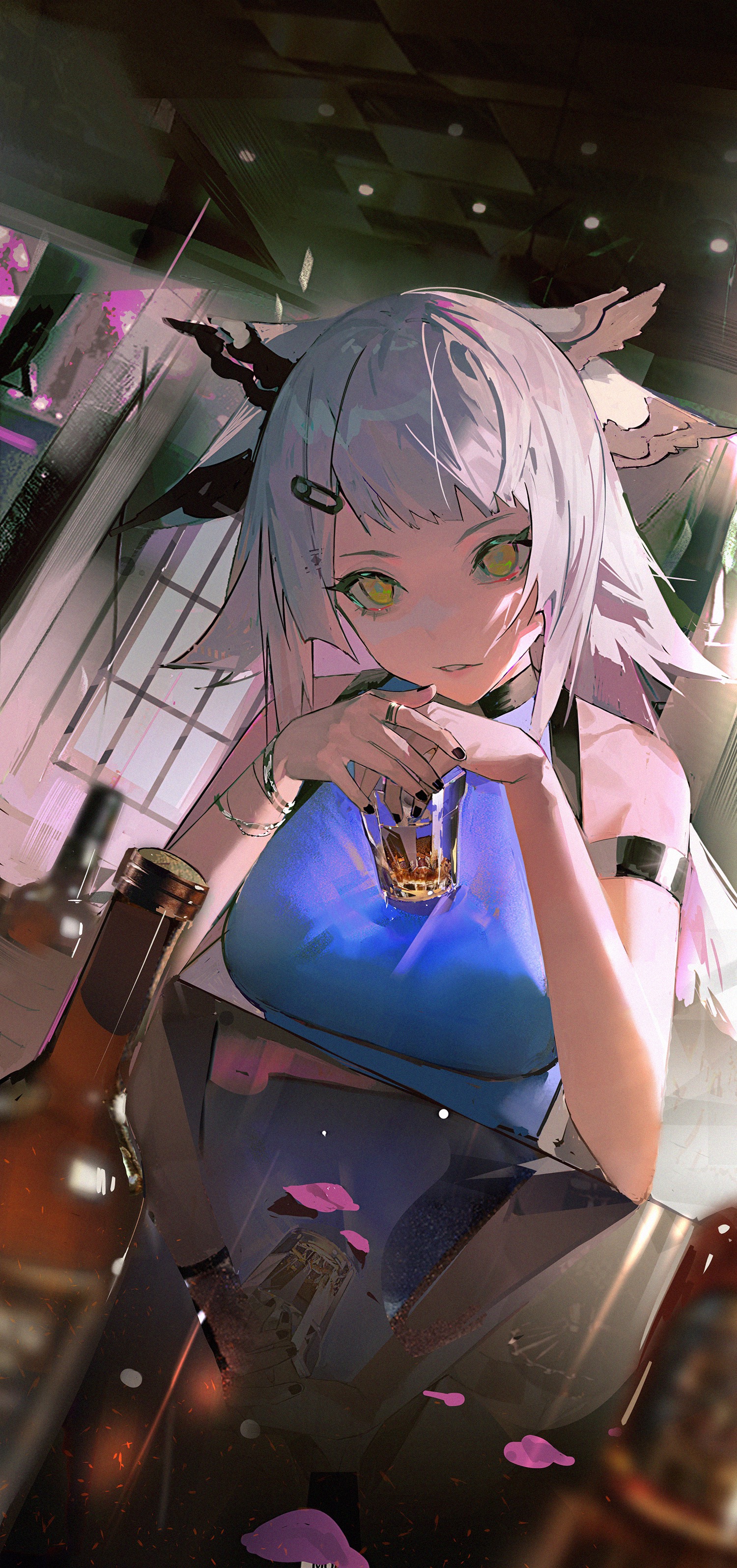 1girl absurdres alcohol alternate_costume ambience_synesthesia arknights arm_strap bare_shoulders black_nails blue_shirt bracelet chinese_commentary commentary_request cup drinking_glass dutch_angle feather_hair glass_bottle hair_ornament hairclip highres holding holding_cup jewelry long_hair looking_at_viewer lyooo_6 nail_polish official_alternate_costume own_hands_together parted_lips petals ptilopsis_(ambience_synesthesia)_(arknights) ptilopsis_(arknights) reflection ring shirt sleeveless sleeveless_shirt solo table white_hair yellow_eyes