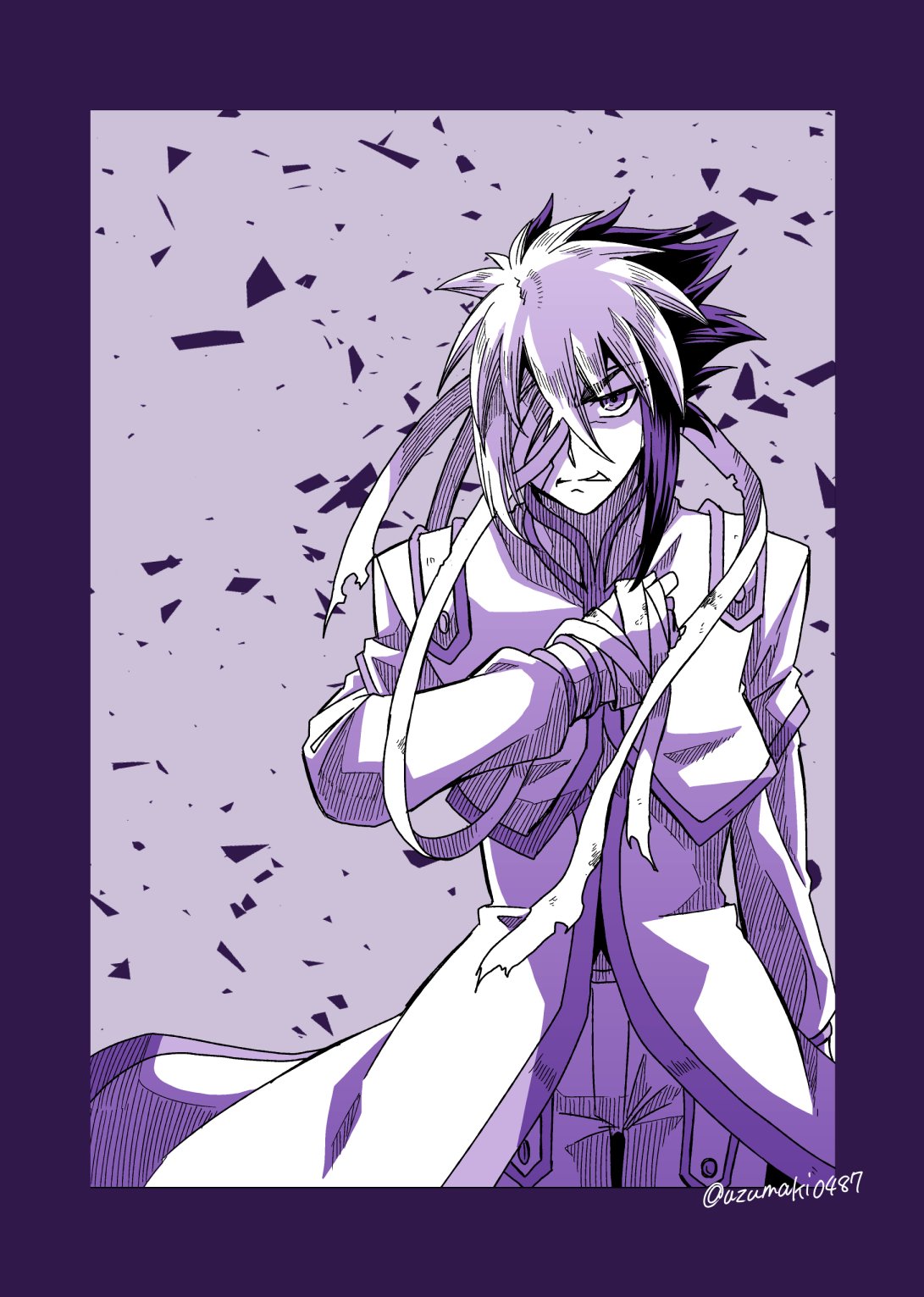 1boy arm_at_side bandage_over_one_eye bandaged_hand bandaged_wrist bandages border capelet clenched_teeth cloak colored_bangs debris facing_viewer hair_slicked_back hand_on_own_chest highres injury iv_(yu-gi-oh!) looking_at_viewer loose_bandages male_focus monochrome one_eye_covered pants partially_colored purple_background purple_border purple_eyes purple_hair purple_trim teeth tunic uzumaki0487 white_capelet white_cloak white_pants white_tunic yu-gi-oh! yu-gi-oh!_zexal