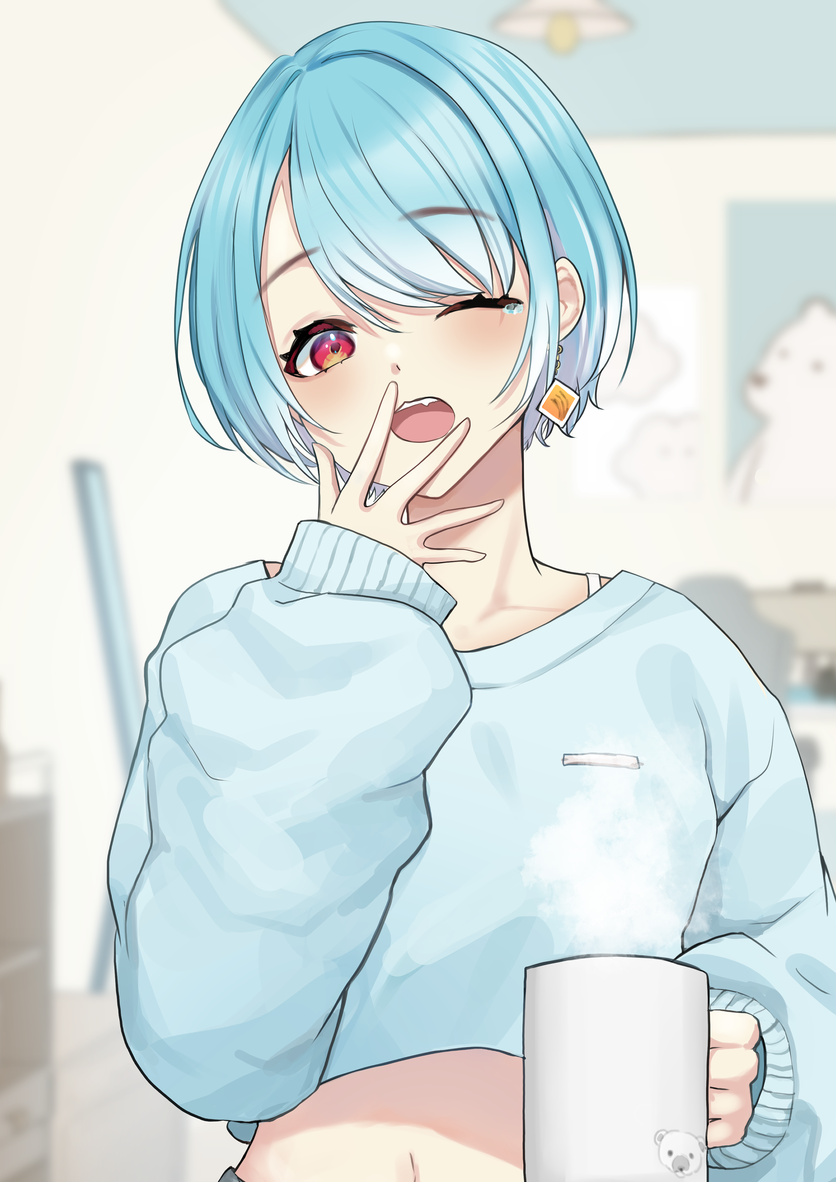 1girl absurdres blue_hair blue_sweater cropped_sweater cup earrings gradient_hair highres holding holding_cup jewelry looking_at_viewer midriff mug multicolored_hair navel one_eye_closed open_mouth parted_bangs red_eyes shiranami_ramune shiranami_ramune_(4th_costume) short_hair single_earring solo sweater tears teeth upper_body upper_teeth_only uri200illust virtual_youtuber vspo! yawning