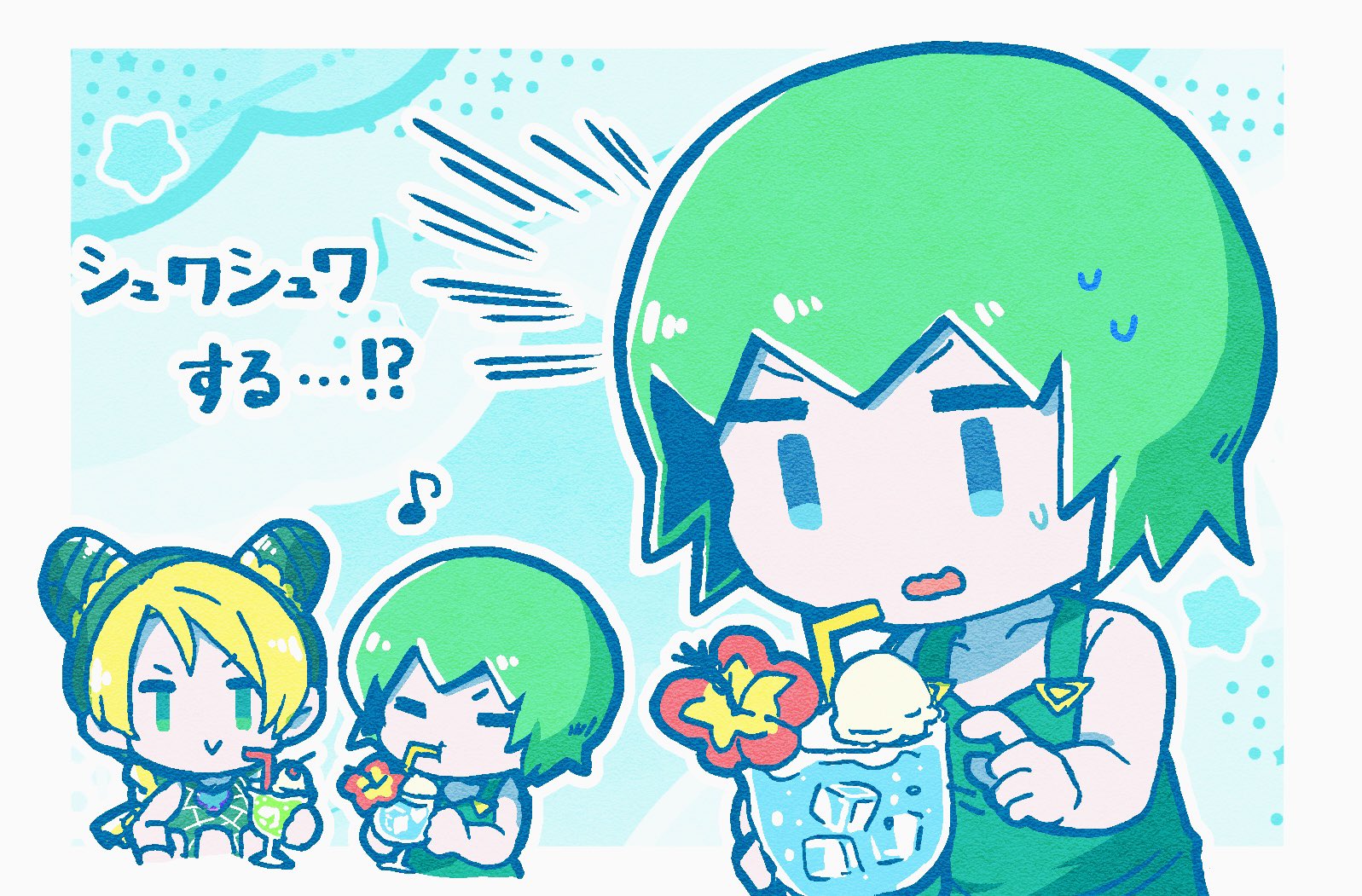2girls black_hair blue_eyes braid braided_bun chibi closed_eyes commentary cup double_bun drink drinking drinking_straw flower foo_fighters_(jojo) food green_eyes green_hair hair_bun hibiscus holding holding_cup ice_cream ice_cream_float jojo_no_kimyou_na_bouken kasasagi_(hinagi) kuujou_jolyne multicolored_hair multiple_girls open_mouth short_hair stone_ocean sweat untranslatable_commentary tank_top translation_request
