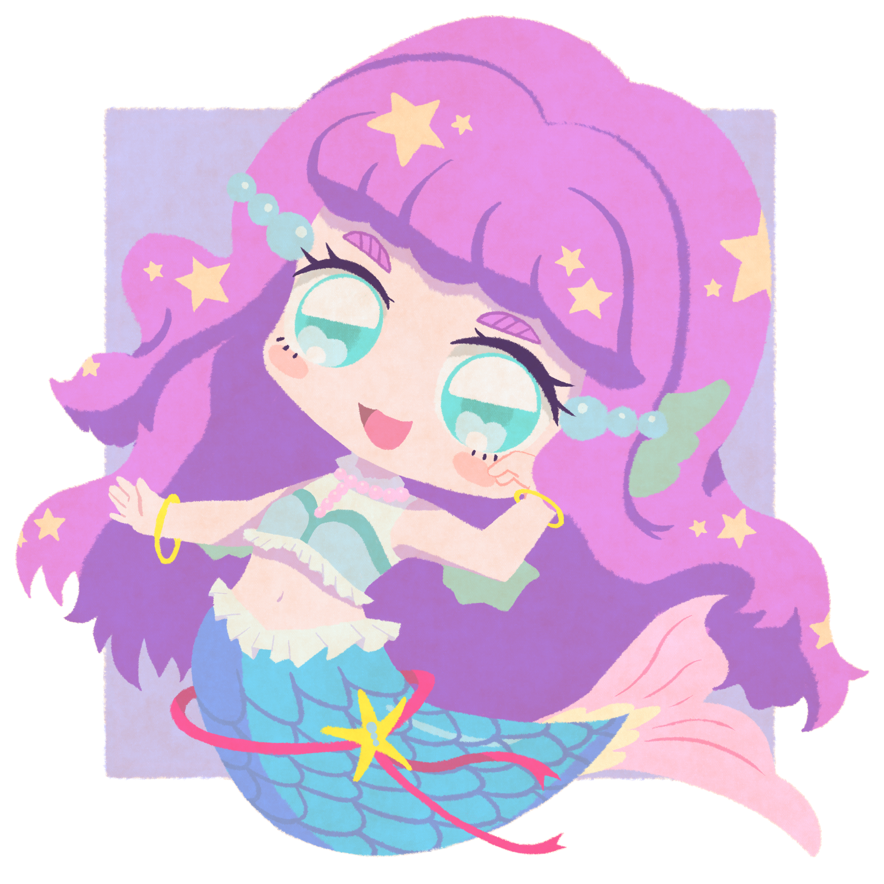 1girl :d absurdres bare_arms blue_eyes blue_scales blush_stickers border bracelet chibi chibi_only commentary crop_top fins frills full_body gold_bracelet hair_ornament hand_on_own_cheek hand_on_own_face head_fins highres jewelry kneeless_merfolk laura_la_mer laura_la_mer_(mermaid) long_hair looking_at_viewer mermaid midriff monster_girl navel necklace open_mouth otannu_(bkdenta) outside_border pearl_hair_ornament pearl_necklace pink_hair pink_ribbon precure purple_background ribbon scales short_bangs sleeveless smile solo star_(symbol) starfish thick_eyebrows tropical-rouge!_precure wavy_hair white_border