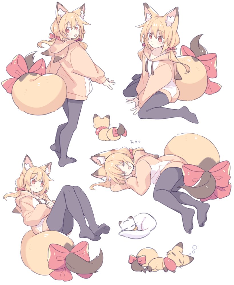 1girl animal_ear_fluff animal_ear_hood animal_ears animalization black_pantyhose blonde_hair bow fake_animal_ears fox fox_ears fox_girl fox_tail from_behind full_body hair_between_eyes hair_bow hood hoodie large_bow looking_at_viewer low_twintails lying multiple_views on_side open_mouth original pantyhose person_and_animalization red_bow red_eyes sitting sleeping smile standing suzuno_(suzuno3110) tail tail_bow tail_ornament twintails v_arms wariza yellow_hoodie