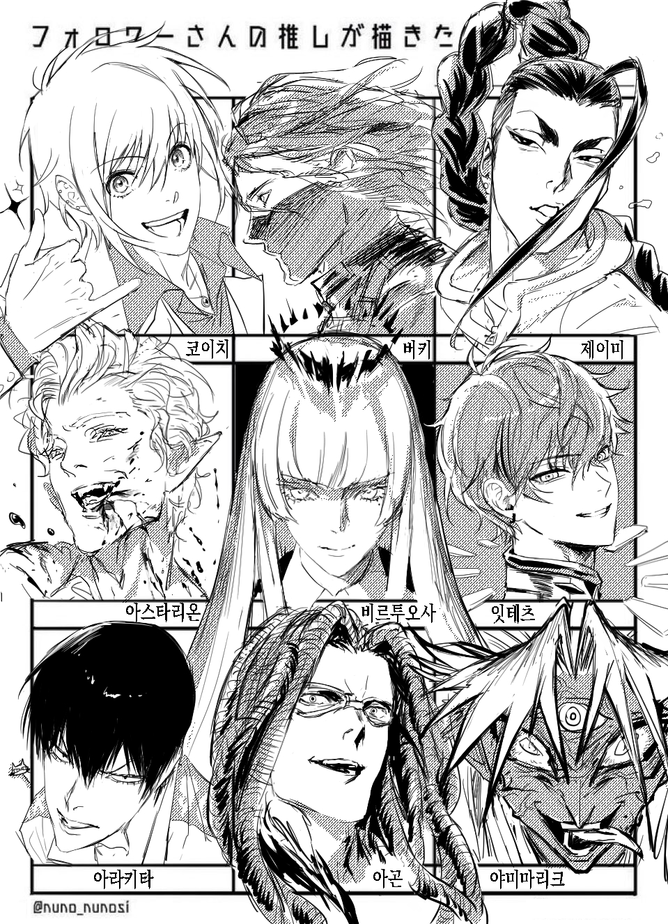character_name character_request closed_mouth copyright_request followers_favorite_challenge glasses greyscale highres korean_text long_hair looking_at_viewer monochrome multiple_drawing_challenge open_mouth or_todd short_hair simple_background smile translation_request upper_body white_background