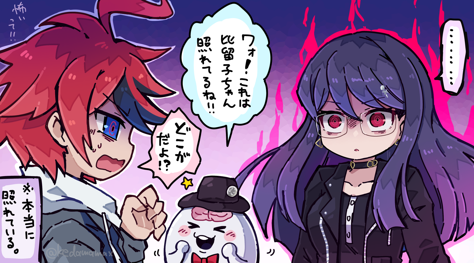 ... 1boy 1girl ahoge aura black_choker black_hat black_jacket black_streaks blue_eyes blush bow bowtie brain choker commentary_request dark_aura earrings glasses grey_jacket hat highres hood hoodie jacket jacket_over_hoodie jewelry kedamamax long_hair multicolored_hair multicolored_jacket purple_hair red_bow red_bowtie red_eyes red_hair shizuhara_hiruko short_hair sirei_(hundred_line) speech_bubble star_(symbol) streaked_hair sumino_takumi the_hundred_line_-last_defense_academy- translation_request two-tone_jacket white_hoodie