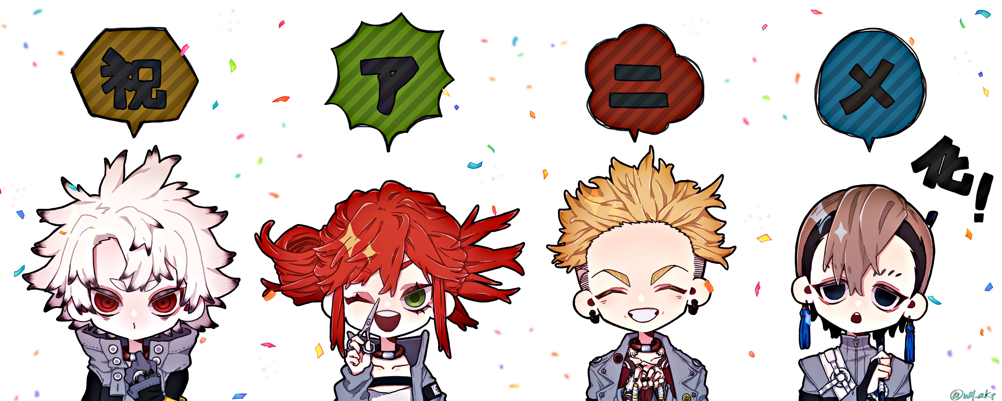 1girl 3boys absurdres artist_request chibi closed_eyes curly_hair ear_piercing earrings enjin_(gachiakuta) gachiakuta green_eyes grey_hair happy highres jacket japanese_text jewelry multiple_boys one_eye_closed open_mouth piercing red_eyes red_hair riyo_reaper rudo_surebrec scissors short_hair smile twintails wink zanka_nijiku