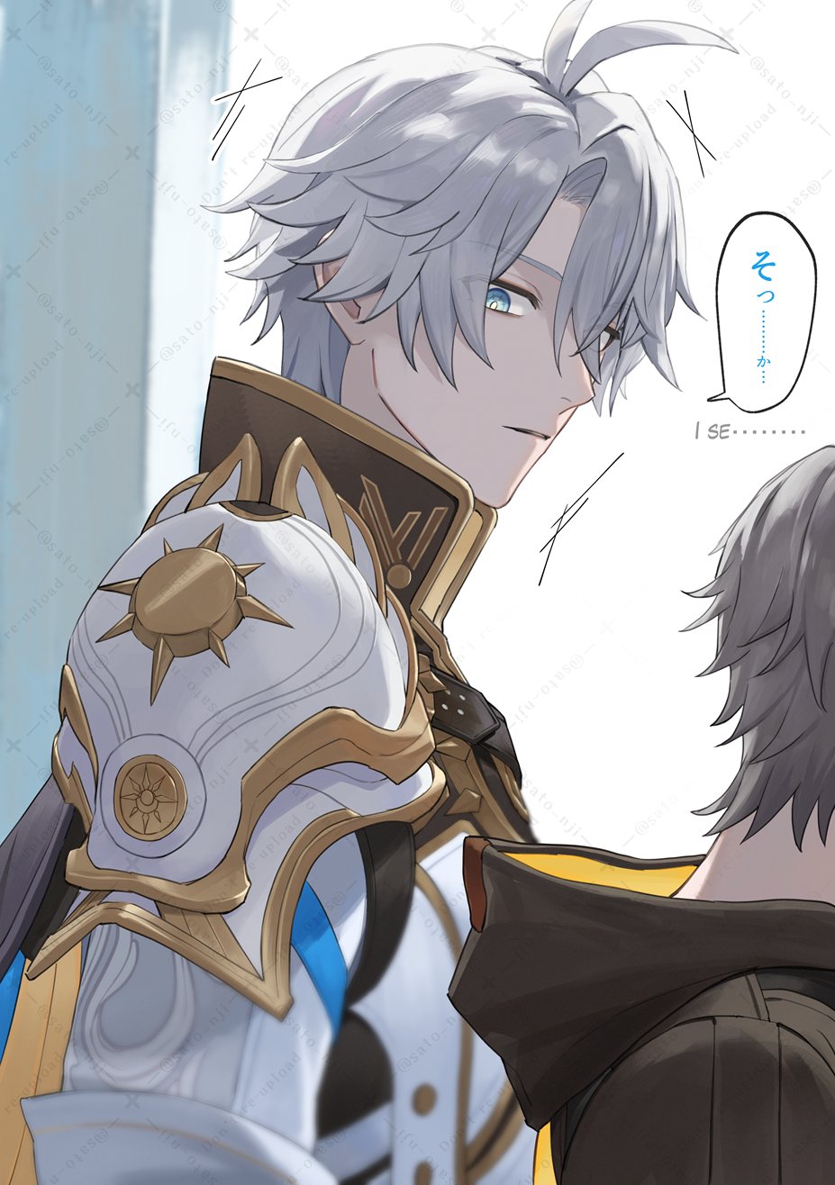 2boys antenna_hair armor black_jacket blue_cape blue_eyes breastplate caelus_(honkai:_star_rail) cape coat english_text eyes_visible_through_hair from_side grey_hair hair_between_eyes height_difference high_collar highres honkai:_star_rail honkai_(series) hood hood_down hooded_jacket jacket looking_at_another male_focus multiple_boys out_of_frame parted_bangs parted_lips pauldrons phainon_(honkai:_star_rail) sato_nji short_hair shoulder_armor simple_background solo_focus speech_bubble trailblazer_(honkai:_star_rail) twitter_username upper_body watermark watermark_grid white_background white_coat yaoi