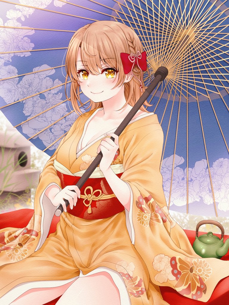 1girl alternate_costume alternate_hairstyle blonde_hair blue_umbrella blush braid breasts cleavage closed_mouth collarbone commentary_request floral_print floral_print_kimono holding holding_umbrella isshiki_iroha japanese_clothes kettle kimono long_sleeves looking_at_viewer obi oil-paper_umbrella print_kimono print_umbrella red_hayao sash short_hair side_braid sitting solo umbrella wide_sleeves yahari_ore_no_seishun_lovecome_wa_machigatteiru. yellow_eyes yellow_kimono yukata