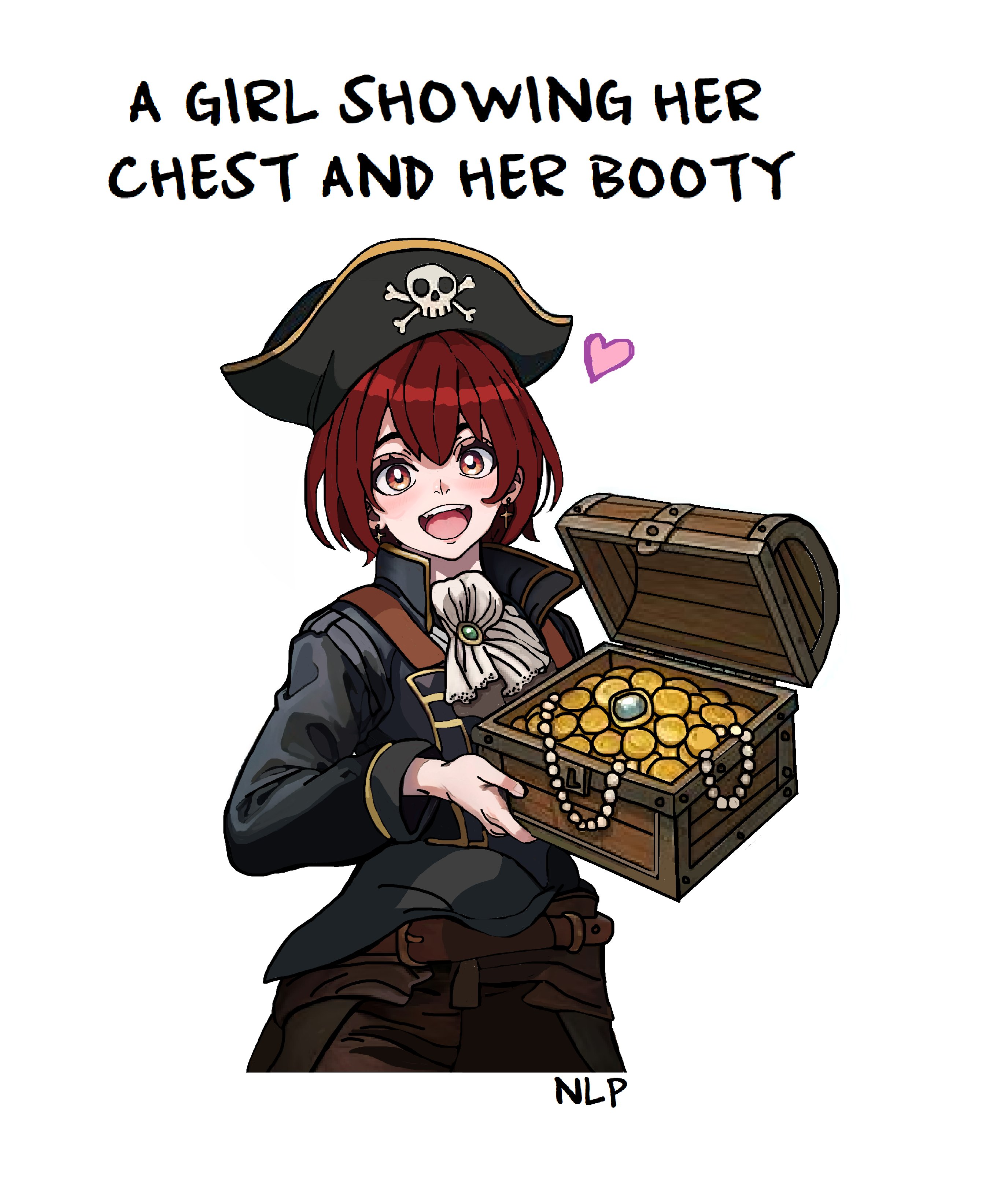 1girl :d absurdres belt chest_(furniture) coin gold_coin hat heart highres jewelry neckerchief necklace noelelepen open_mouth orange_eyes original pearl_necklace pirate_costume pirate_hat pun red_hair skull_and_crossbones smile solo