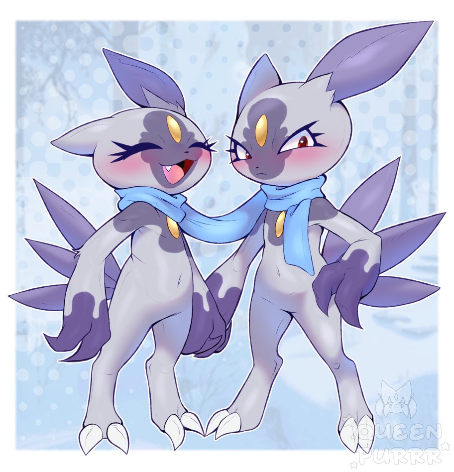 1boy 1girl :3 ^_^ animal_ears animal_feet animal_hands animal_nose arms_at_sides averting_eyes blue_background blue_scarf blurry blurry_background blush body_fur border chest_jewel claws closed_eyes closed_mouth couple embarrassed fang forehead_jewel full_body furry furry_female furry_male furry_with_furry gem grey_fur happy hetero hisuian_sneasel looking_to_the_side multiple_tails navel nintendo open_mouth outdoors outline outside_border pokemon pokemon_(creature) purple_fur queen_purrr red_eyes scarf shared_clothes shared_scarf smile standing stomach tail two-tone_fur watermark white_border white_outline yellow_gem