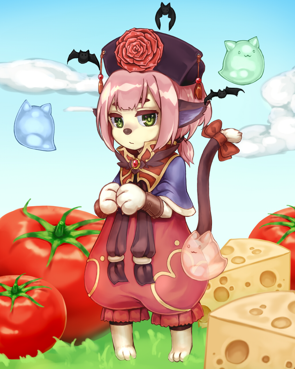 1girl animal_ears atelier-ainel barefoot bat_(animal) black_hat blue_capelet bow capelet cat_ears cat_girl cat_tail cheese closed_mouth commentary_request expressionless flower food full_body furry furry_female ghost grass green_eyes hat hat_flower highres looking_at_viewer pants pink_hair pink_pants ragnarok_online red_bow red_flower red_rose rose short_hair solo standing summoner_(ragnarok_online) swiss_cheese tail tail_bow tail_ornament tassel tomato