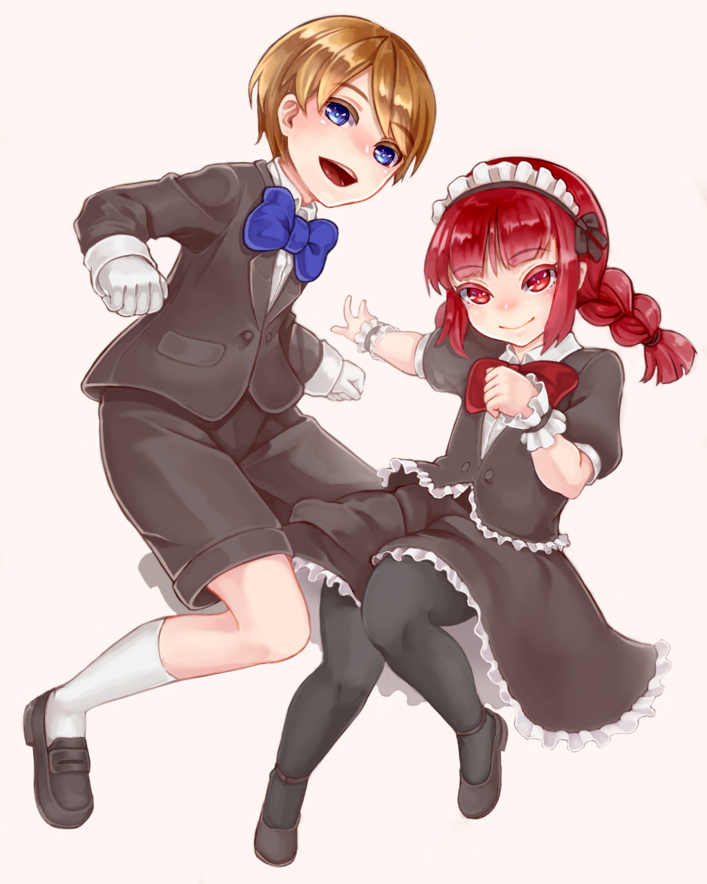 1boy 1girl :d atelier-ainel black_jacket black_pantyhose black_shirt black_shoes black_shorts black_skirt black_socks blazer blue_bow blue_bowtie blue_eyes blunt_bangs bow bowtie braid brown_hair child closed_mouth commentary_request formal_clothes frilled_skirt frills full_body gloves grey_background highres jacket loafers long_sleeves looking_at_viewer low_twin_braids maid maid_headdress medium_hair open_mouth pantyhose puffy_short_sleeves puffy_sleeves ragnarok_online red_bow red_bowtie red_hair shirt shoes short_hair short_sleeves shorts simple_background skirt skirt_set smile socks standing suit twin_braids white_gloves white_shirt white_socks wrist_cuffs zonda_novice