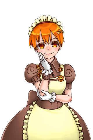 1girl apron atelier-ainel blush brown_dress closed_mouth collared_shirt commentary_request cowboy_shot dress flower frilled_apron frills gloves hair_ornament hand_on_own_cheek hand_on_own_face kafra_uniform looking_at_viewer lowres maid maid_headdress orange_eyes orange_flower orange_hair puffy_short_sleeves puffy_sleeves ragnarok_online roxie_(ragnarok_online) shirt short_hair short_sleeves simple_background smile solo transparent_background white_gloves x_hair_ornament yellow_apron