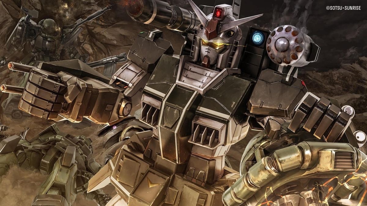 arm_cannon battle cable company_name copyright_notice full_armor_gundam gatling_gun glowing glowing_eyes gundam gundam_battle_operation_2 gundam_msv lens_flare machinery mecha mecha_focus missile_pod mobile_suit official_art painting_(medium) realistic robot scan science_fiction severed_head shoulder_cannon sunrise_(company) tenjin_hidetaka traditional_media v-fin weapon wreckage yellow_eyes zaku_ii