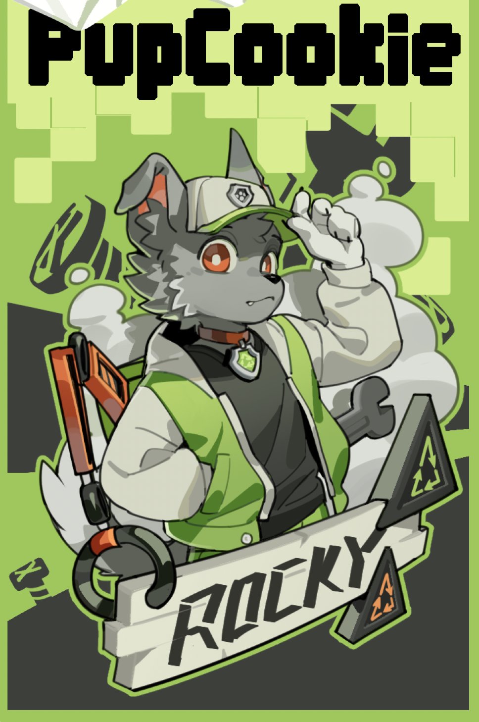 1boy animal_ears black_shirt character_name chinese_commentary claws closed_mouth commentary_request dog_boy dog_ears dog_tail english_text furry furry_male green_jacket grey_fur hand_in_pocket hand_on_headwear hat highres jacket looking_at_viewer male_focus mechanical_arms paw_patrol rakkasei_l rocky_(paw_patrol) shirt tail white_hat