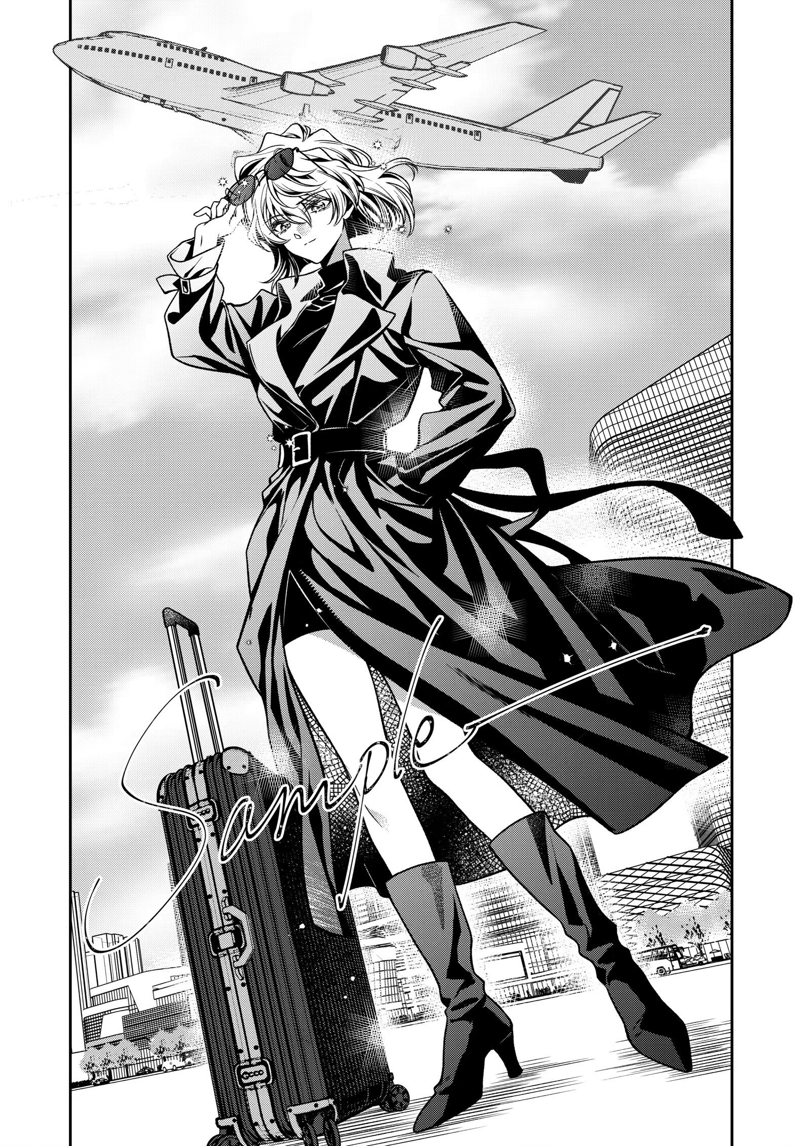 1girl adjusting_eyewear aircraft airplane belt boots building chinese_commentary city closed_mouth coat commentary_request eyewear_on_head full_body greyscale hand_in_pocket high_heel_boots high_heels highres long_sleeves looking_at_viewer meitantei_conan miyano_shiho monochrome outdoors pillarboxed rolling_suitcase sample_watermark short_hair solo standing suitcase sunglasses watermark yan_yan_zhishi_naicha