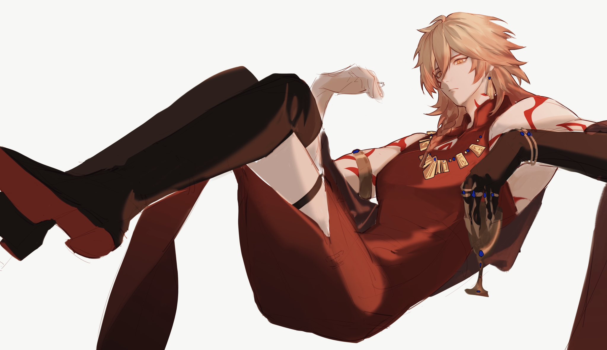 1boy arm_tattoo armlet black_boots blonde_hair boots braid crossdressing crossdressing_(mtf) cup dress earrings facial_tattoo gold_earrings gold_necklace gradient_hair hair_between_eyes hashtag-only_commentary highres holding holding_cup honkai:_star_rail honkai_(series) jewelry knee_boots male_focus medium_hair multicolored_hair mydei_(honkai:_star_rail) necklace red_dress red_hair red_tattoo sheunsnzh side_braid simple_background solo tattoo white_background yellow_eyes