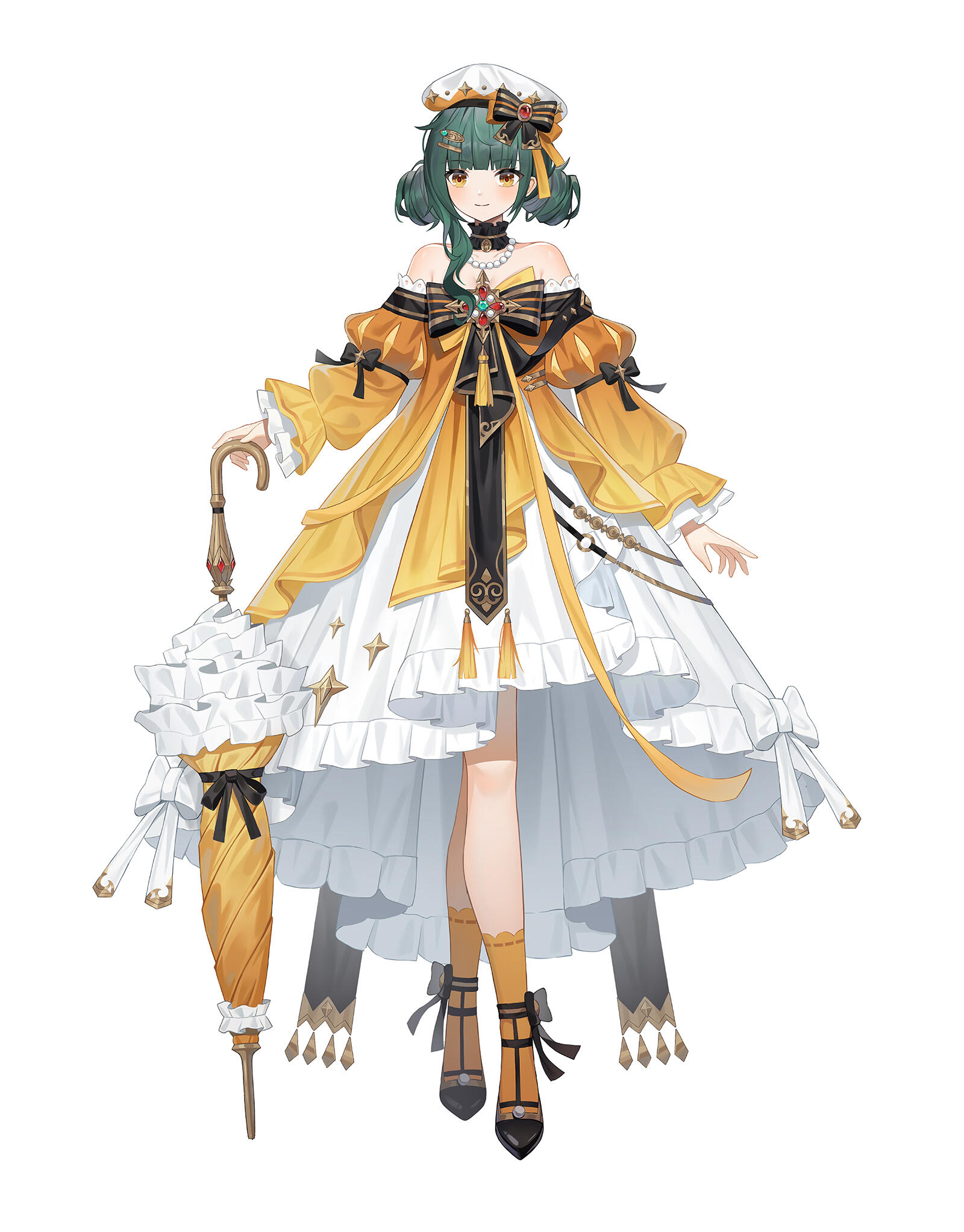 1girl bad_source bare_shoulders beret black_bow blush bow braid brown_eyes closed_umbrella collarbone detached_sleeves double_bun dress frills full_body green_hair hair_bow hair_bun hair_ornament hat highres holding holding_umbrella long_sleeves looking_at_viewer off-shoulder_dress off_shoulder original shoes simple_background single_sidelock smile socks solo standing tinylee umbrella very_low_bun virtual_youtuber white_background white_dress yellow_eyes yellow_socks