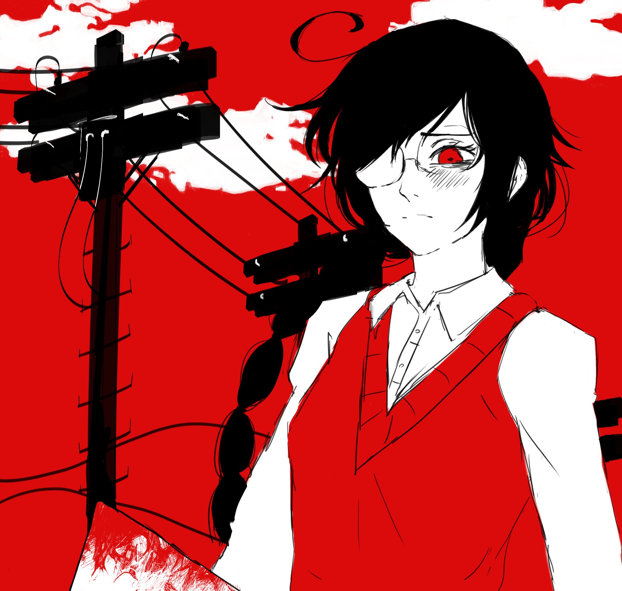 1girl ahoge blood bloody_weapon braid cleaver closed_mouth cloud collared_shirt commentary english_commentary expressionless funamusea glasses highres holding holding_cleaver holding_weapon hyuchl katagiri_mikari_(funamusea) long_hair low_twin_braids opaque_glasses outdoors partially_opaque_glasses power_lines red_sky red_theme round_eyewear shirt sketch sky solo twin_braids upper_body utility_pole very_long_hair vest weapon