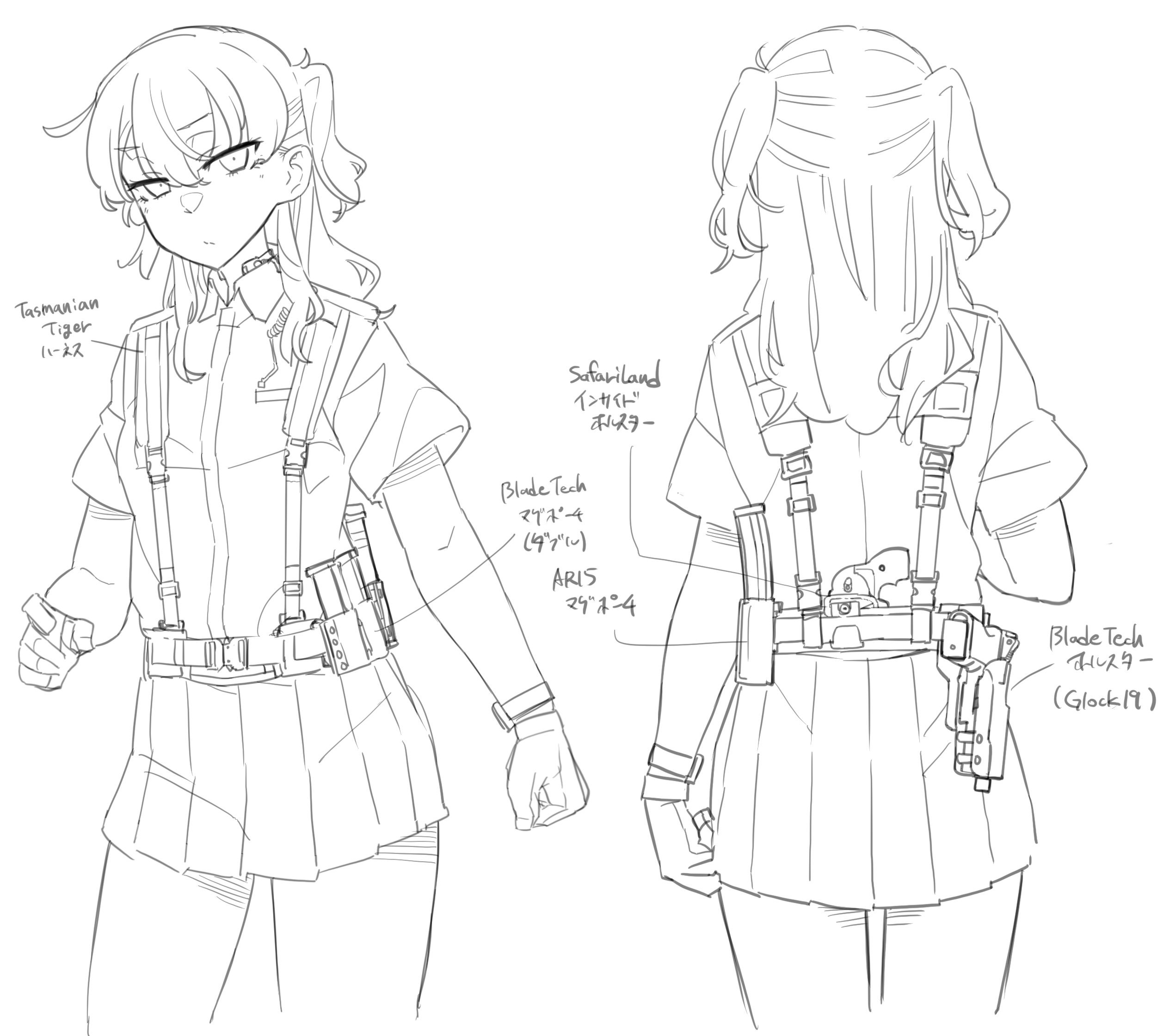 1girl desert_(deserteagle0321) earpiece glock greyscale gun handgun highres holster holstered long_hair magazine_(weapon) monochrome original translation_request two_side_up weapon white_background