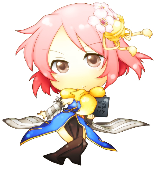 1girl alternate_color animal animal_around_neck bell blue_dress book brown_eyes chibi chibi_only closed_mouth commentary_request detached_sleeves dress flower fox full_body grey_sleeves hair_bell hair_flower hair_ornament holding holding_book jingle_bell kinoko_(kinoko_v) looking_at_viewer pelvic_curtain pink_flower pink_hair professor_(ragnarok_online) ragnarok_online short_hair simple_background sleeveless sleeveless_dress solo striped_sleeves white_background white_sleeves