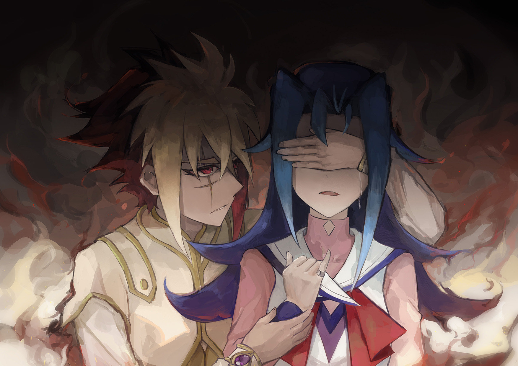 1boy 1girl colored_bangs covering_another's_eyes crying embers facing_another facing_viewer goldmise hair_slicked_back hand_on_another's_face hand_on_another's_wrist highres iv_(yu-gi-oh!) kamishiro_rio long_sleeves looking_at_another multiple_scars open_mouth outdoors parted_bangs parted_hair pink_shirt pinky_out pinky_ring purple_hair red_eyes red_hair red_ribbon ribbon sailor_collar scar scar_on_face shirt smoke spiked_hair streaming_tears tears tunic upper_body vignetting white_sailor_collar white_shirt white_tunic yu-gi-oh! yu-gi-oh!_zexal