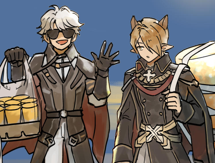 2boys animal_ears basket belt black_belt black_cape black_coat black_gloves blue_background brown_cape brown_hair buttons cape cat_boy cat_ears chinese_commentary coat commentary_request cowboy_shot double-breasted gloves grey_hair hair_between_eyes holding holding_basket kyou_bocchan male_focus military_uniform multiple_boys night_watch_(ragnarok_online) open_mouth pants pointy_ears ragnarok_online rebellion_(ragnarok_online) shirt short_hair smile sunglasses two-sided_cape two-sided_fabric white_pants white_shirt yellow_eyes