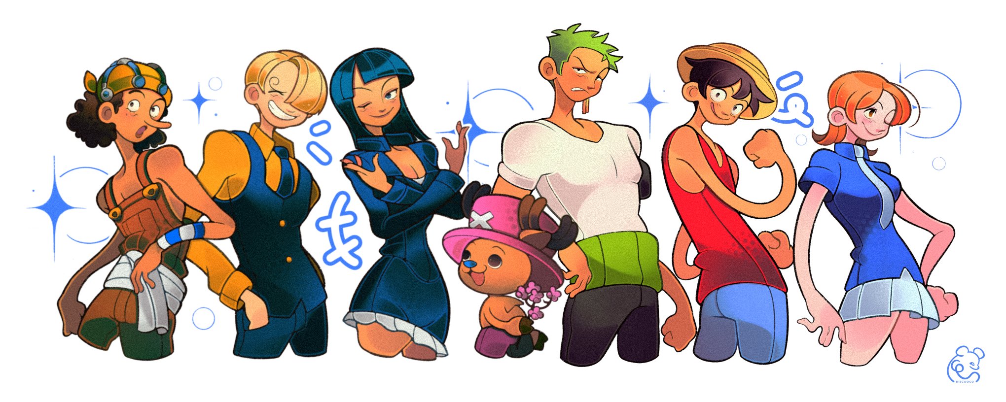 2025 2girls 5boys ^_^ antlers black_hair black_vest blonde_hair blue_shirt blunt_bangs brown_overalls closed_eyes collared_shirt commentary cowboy_shot cross curly_eyebrows discooco earrings english_commentary green_hair hand_on_own_hip haramaki hat highres horns jewelry leather_dress long_nose medium_hair monkey_d._luffy multiple_boys multiple_girls nami_(one_piece) nami_(one_piece)_(water_7) necktie nico_robin nico_robin_(water_7) official_alternate_costume one_eye_closed one_piece orange_hair overalls pink_hat red_shirt reindeer_antlers roronoa_zoro sanji_(one_piece) sash shirt short_hair skirt smile straw_hat_pirates tony_tony_chopper usopp vest white_sash wristband yellow_shirt
