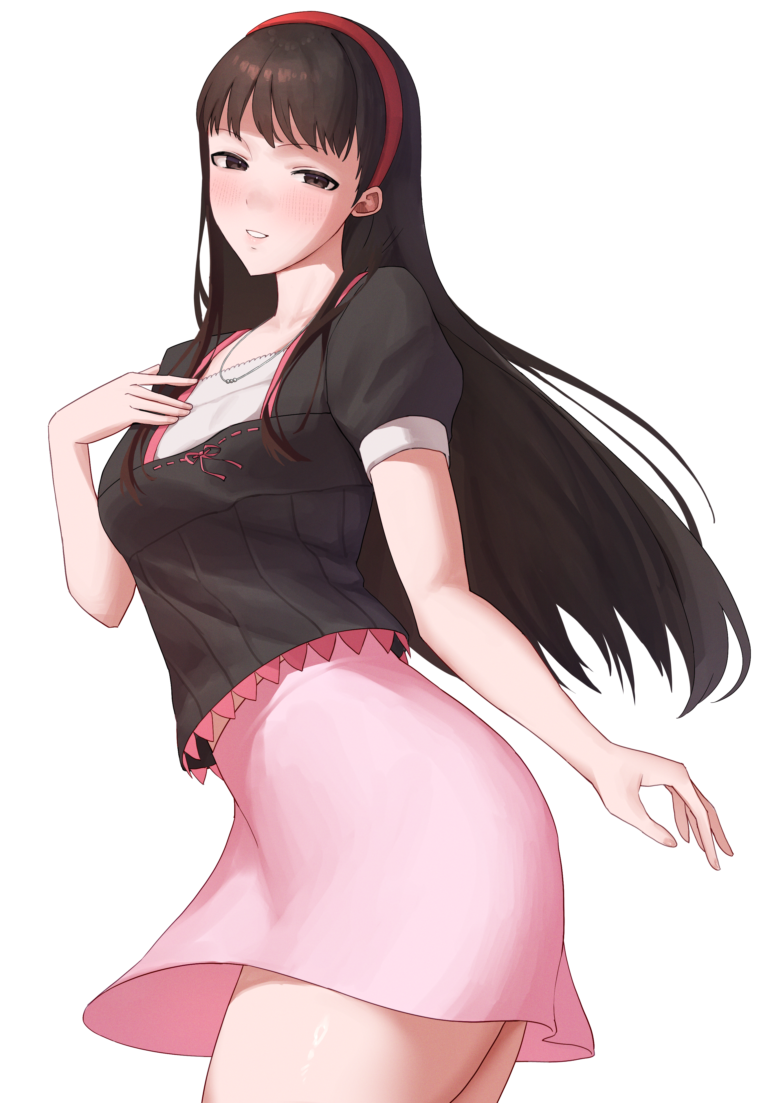 1girl absurdres amagi_yukiko black_hair black_shirt blunt_bangs blush breasts brown_eyes commission commissioner_upload cowboy_shot hairband hand_on_own_chest hand_up highres jewelry long_hair looking_at_viewer medium_breasts midriff_peek necklace non-web_source parted_lips persona persona_4 pink_skirt puffy_short_sleeves puffy_sleeves red_hairband shirt short_sleeves simple_background skirt smile solo turnipdish white_background