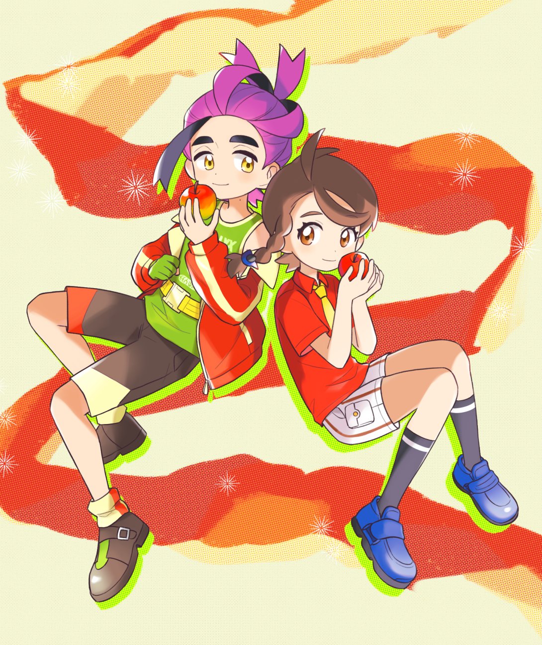 1boy 1girl apple apple_peel black_hair black_shorts black_socks blush braid brown_eyes brown_hair closed_mouth collared_shirt food fruit gloves green_gloves green_tank_top hair_ornament highres holding holding_food holding_fruit jacket juliana_(pokemon) kieran_(pokemon) long_sleeves mole mole_on_neck necktie nekoniko777 nintendo official_alternate_color pokemon pokemon_masters_ex purple_hair red_jacket red_shirt shirt shoes short_sleeves shorts single_glove socks tank_top white_shorts yellow_eyes yellow_necktie yellow_socks