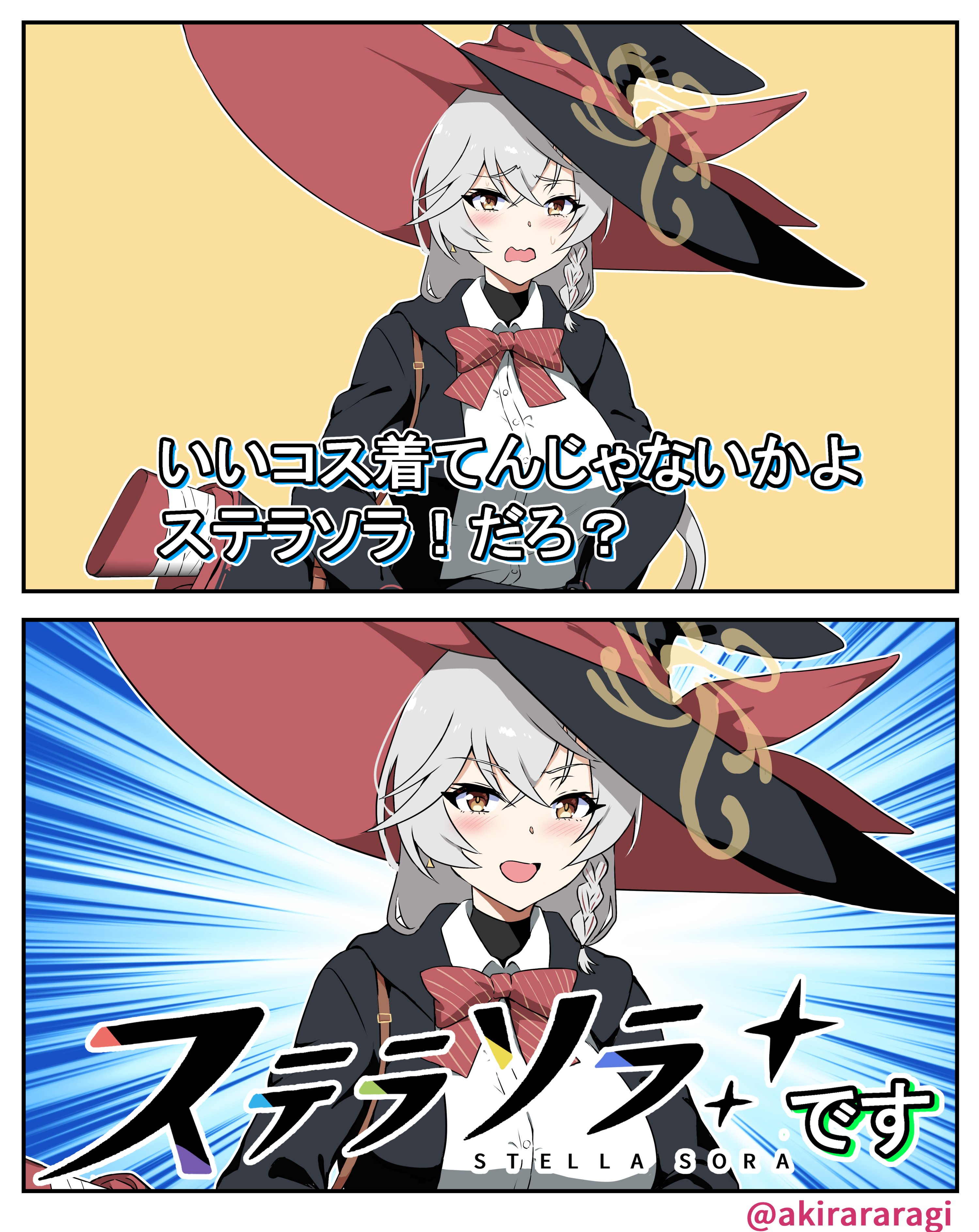 absurdres akirararagi blue_archive bow bowtie braid cosplay eri_(blue_archive) eri_(blue_archive)_(cosplay) halo hat highres jacket long_coat long_hair panties shirt skirt stella_sora sweater underwear white_hair witch_hat