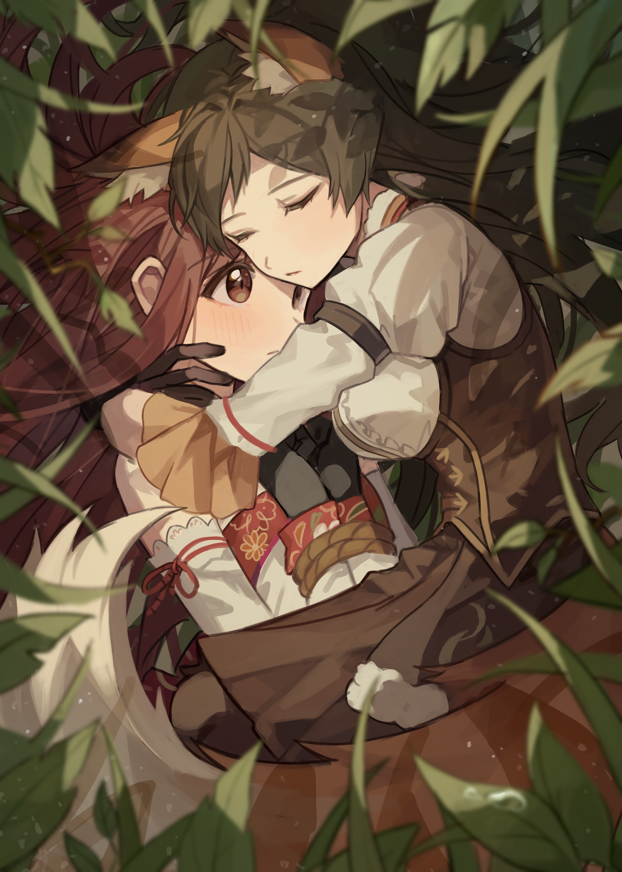 2girls absurdres animal_ear_fluff animal_ears bound bound_wrists brown_dress brown_eyes brown_hair closed_eyes closed_mouth dress foliage hano9789 highres hug idolmaster idolmaster_million_live! kemonomimi_mode kitazawa_shiho long_hair long_sleeves lying multiple_girls outdoors red_hair rope tail tanaka_kotoha yuri