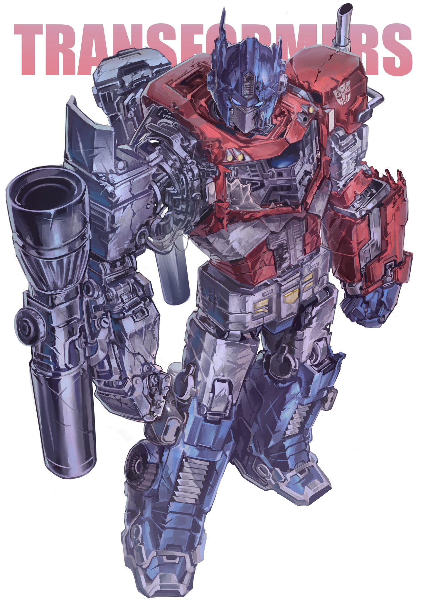 battle_damage blue_eyes damaged gun highres insignia looking_at_viewer machine machinery mecha nameno92372763 no_humans optimus_prime robot science_fiction solo transformers weapon
