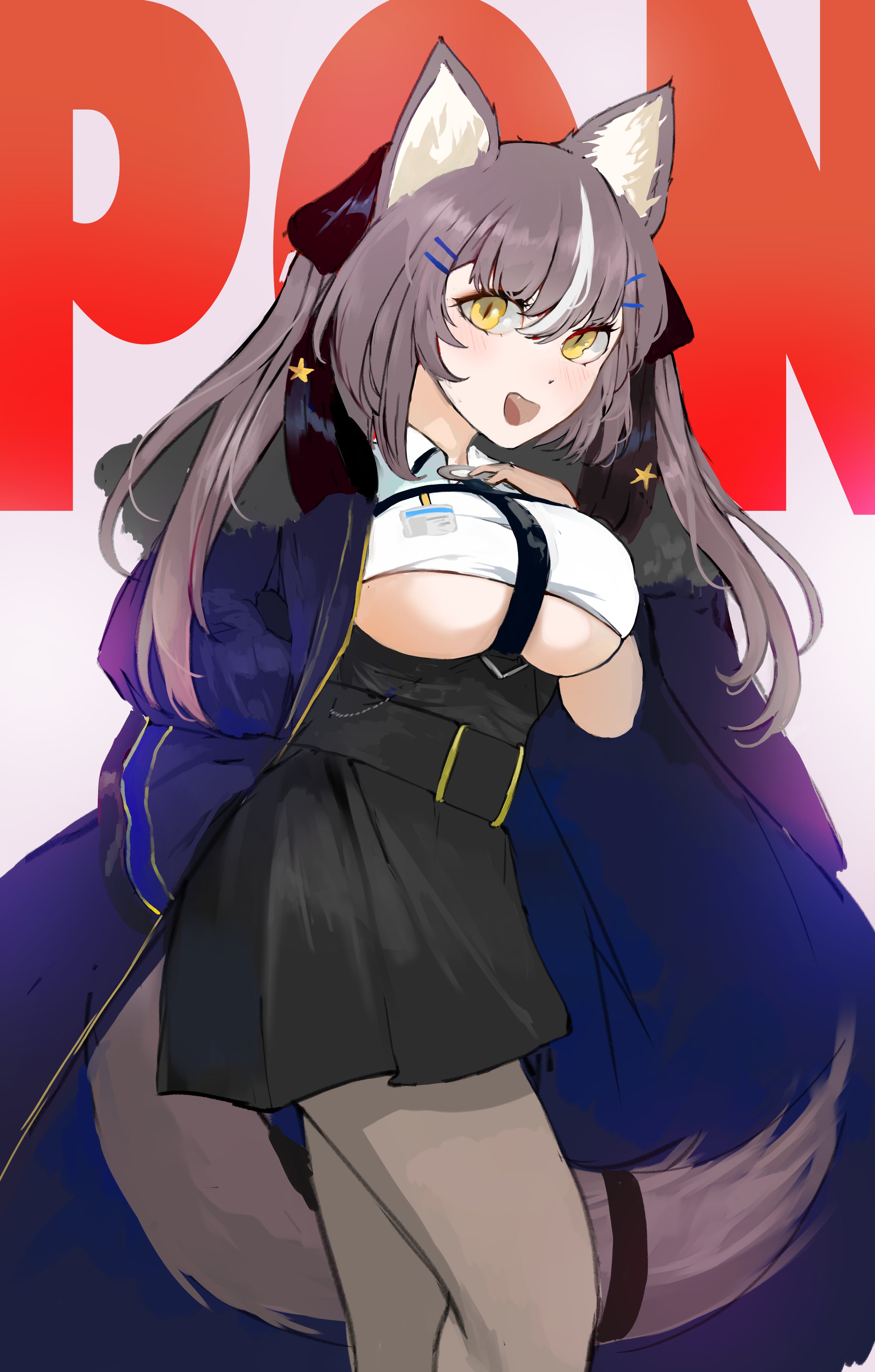 1girl absurdres animal_ear_fluff animal_ears artist_request breasts brown_hair chisaka_airi crop_top harness highres jacket looking_at_viewer multicolored_hair pantyhose phase_connect skirt streaked_hair tail underboob virtual_youtuber white_hair wolf_ears wolf_tail yellow_eyes