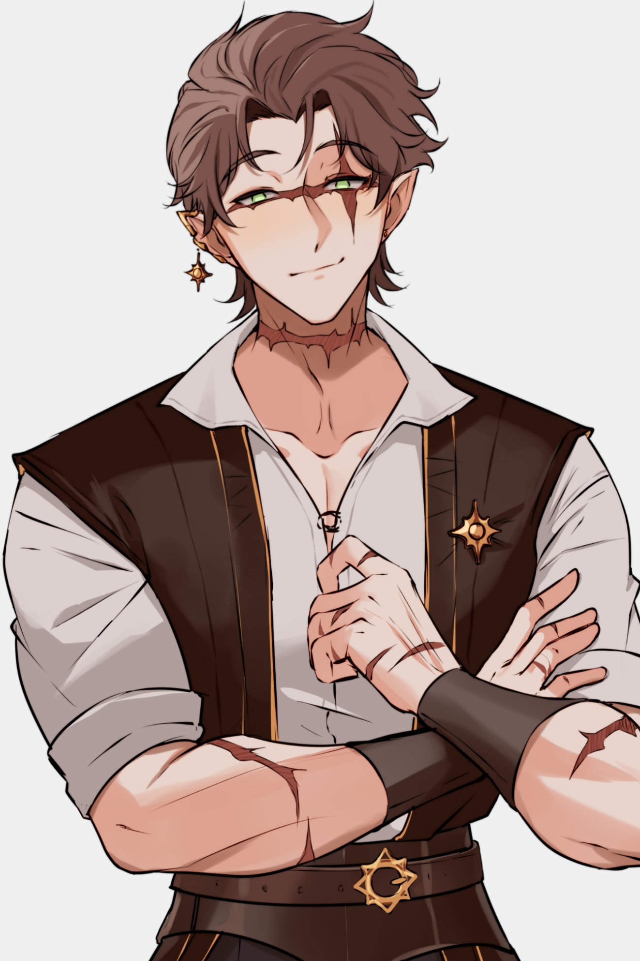 1boy 1hp_club alternate_costume brown_hair brown_tunic collared_shirt crossed_arms earrings elfboiii green_eyes hair_slicked_back hand_up head_tilt highres jewelry looking_at_viewer male_focus mullet multiple_scars pectoral_cleavage pectorals scar scar_across_eye scar_on_arm scar_on_face scar_on_neck shirt single_earring smile solaire_(1hp_club) solo tunic upper_body white_shirt wrist_cuffs