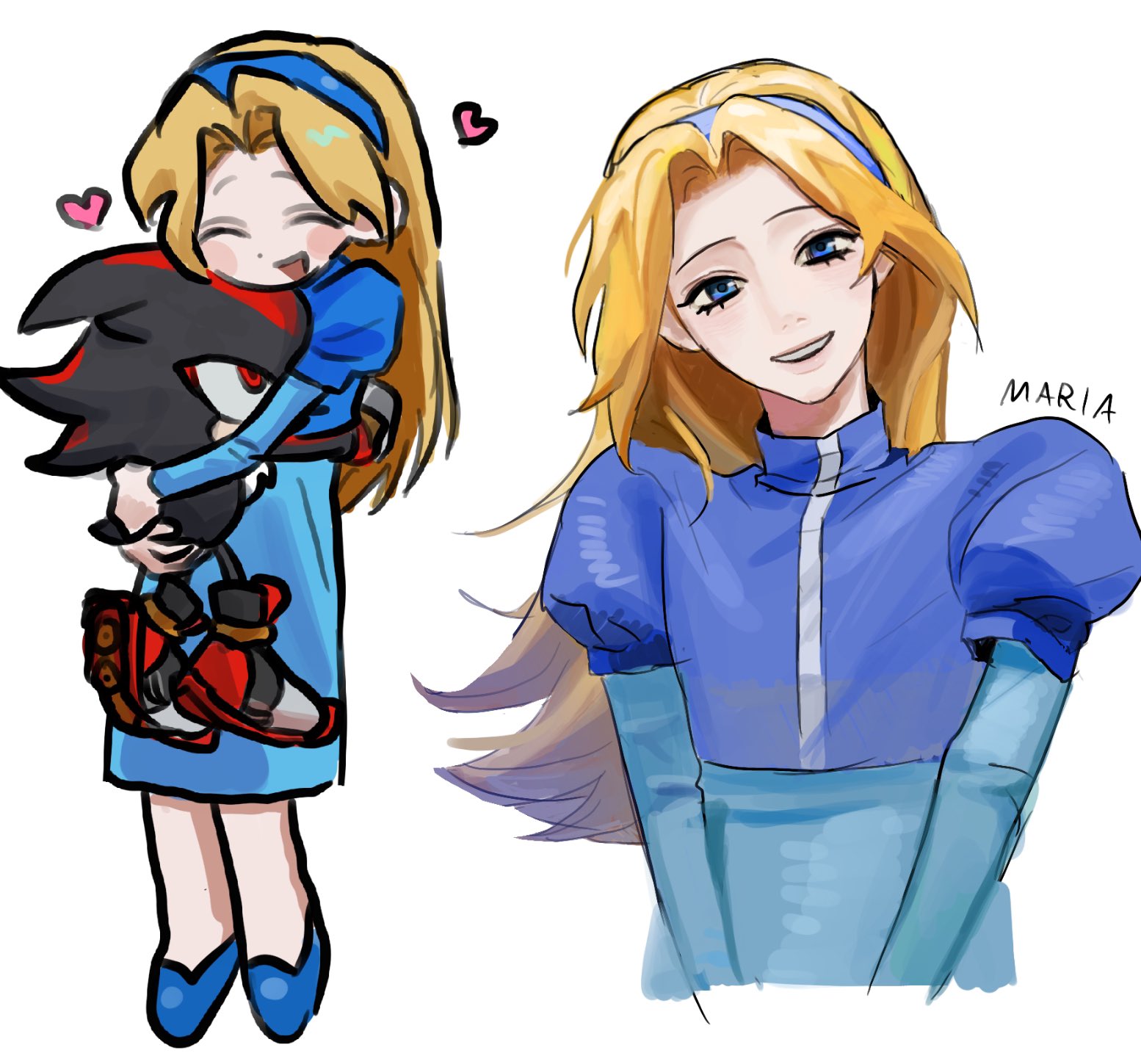 1boy 1girl arms_around_another's_back black_fur blonde_hair blue_dress blue_eyes blue_hairband blue_jacket blue_shoes blush character_name closed_eyes cropped_jacket dress flat_chest full_body furry furry_male hairband hedgehog_boy highres hug jacket long_hair looking_at_viewer maria_robotnik multiple_views nannan_maoma0 open_mouth parted_bangs puffy_short_sleeves puffy_sleeves red_eyes red_fur red_shoes shadow_the_hedgehog shadow_the_hedgehog_(game) shoes short_sleeves smile sonic_(series) upper_body v_arms white_background