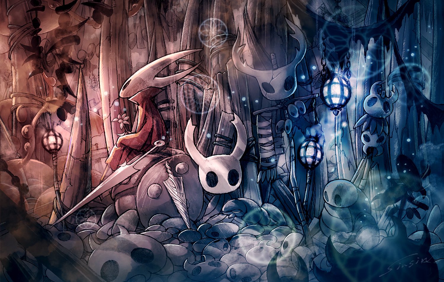1girl 1other cloak flower hollow_knight hornet_(hollow_knight) horns knight_(hollow_knight) lantern mamoru_mikokoro nail_(hollow_knight) needle_(hollow_knight) pure_nail_(hollow_knight) red_cloak sitting skull