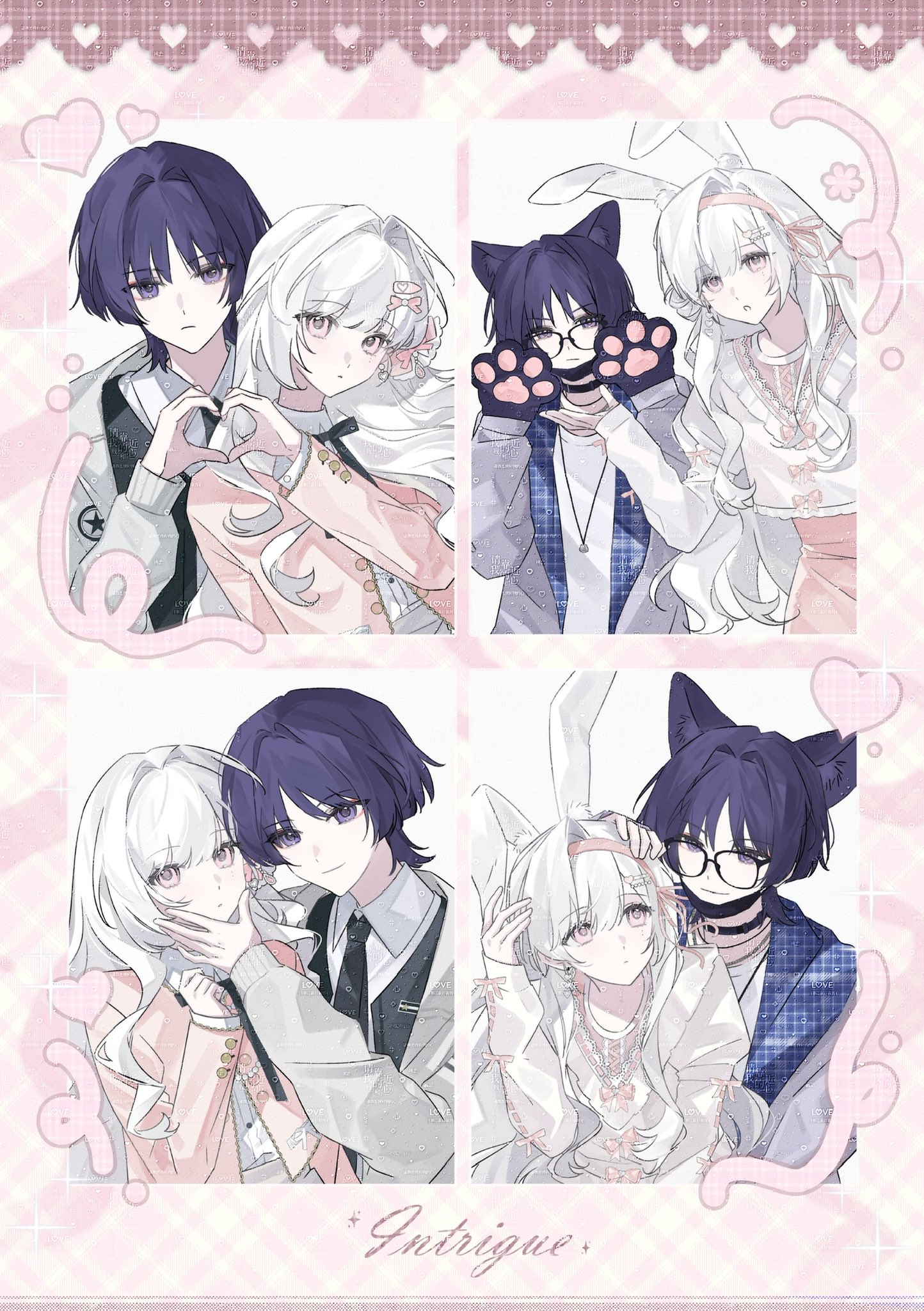 1boy 1girl animal_ear_fluff animal_ears animal_hands artist_request bespectacled black-framed_eyewear black_choker black_necktie black_ribbon black_vest blouse blunt_bangs blunt_ends border cat_boy cat_ears cat_paws choker closed_mouth commission commissioner_insert couple cross-laced_clothes cross-laced_top dress eyelashes frilled_shirt frills genshin_impact glasses hair_intakes hair_ornament hair_ribbon hairband hairclip hand_on_another's_cheek hand_on_another's_face hand_on_another's_head hand_up hayami_momo_(hayamimomo) heads_together heart heart_hands heart_hands_duo hetero highres jacket layered_sleeves leaning_on_person long_hair long_sleeves looking_at_another looking_at_viewer mole mole_under_eye multiple_views necktie open_hand open_mouth original parted_bangs pink_border pink_dress pink_eyes pink_hairband pink_ribbon pink_shirt pink_sleeves purikura purple_eyes purple_hair rabbit_ears rabbit_girl ribbon scaramouche_(genshin_impact) second-party_source shirt sidelocks smile sparkle tsurime undershirt vest white_hair white_jacket white_mouth white_shirt white_sleeves