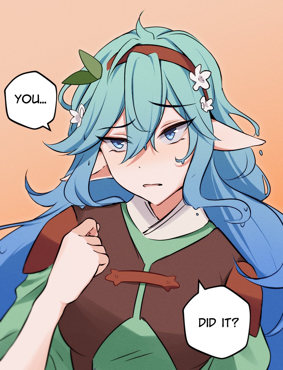 1girl 1hp_club blue_eyes blue_hair brown_tunic commentary elfboiii english_commentary english_text ffion_(1hp_club) flower gradient_hair green_shirt hair_between_eyes hair_flower hair_ornament hairband hand_up head_tilt highres leaf_hair_ornament multicolored_hair pointy_ears raised_eyebrow shirt shoulder_pads sidelocks solo speech_bubble tunic upper_body wavy_hair worried