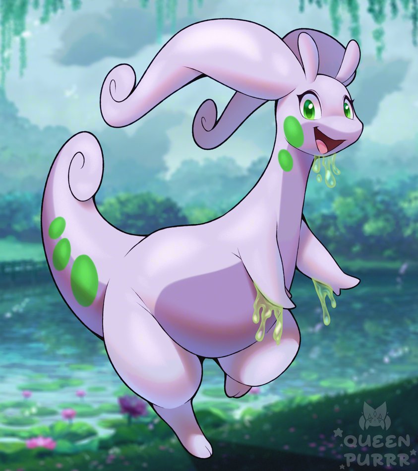 animal_focus artist_name blurry blurry_background dripping full_body gen_6_pokemon goodra green_eyes happy looking_at_viewer nintendo no_humans open_mouth outdoors pokemon pokemon_(creature) queen_purrr slime_(substance) smile solo standing tongue watermark