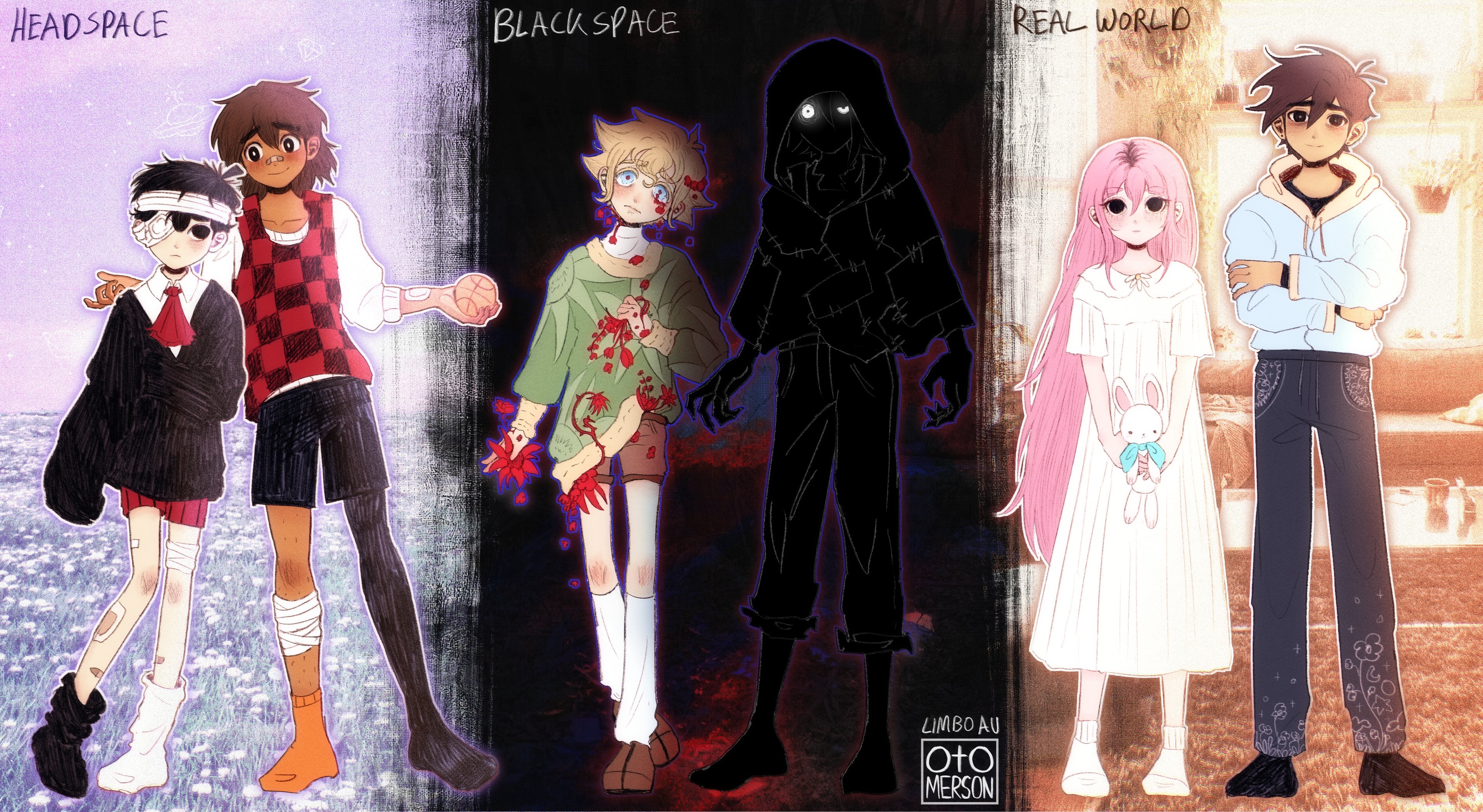 1girl 5boys absurdres alternate_costume alternate_eye_color alternate_universe antenna_hair artist_name asymmetrical_legwear aubrey_(faraway)_(omori) aubrey_(omori) bags_under_eyes ball bandaged_head bandaged_leg bandages bandaid bandaid_on_arm bandaid_on_face bandaid_on_leg bandaid_on_nose basil_(faraway)_(omori) basil_(omori) basketball_(object) black_eyes black_hair black_pants black_shoes black_shorts black_skin black_socks black_sweater black_thighhighs blonde_hair blood blood_on_clothes blue_eyes blue_hoodie brown_hair brown_shoes brown_shorts closed_mouth collarbone collared_shirt colored_skin dark-skinned_male dark_skin dress expressionless eyepatch full_body green_sweater hair_between_eyes hero_(faraway)_(omori) hero_(omori) highres holding holding_ball holding_stuffed_toy hood hood_down hood_up hoodie kel_(faraway)_(omori) kel_(omori) kneehighs long_hair long_sleeves looking_at_viewer medical_eyepatch mismatched_legwear multicolored_hair multiple_boys musical_note omori orange_socks otomerson pants pink_hair plant red_shorts roots_(hair) shirt shoes short_hair shorts single_sock single_thighhigh sleeves_past_fingers sleeves_past_wrists socks spoilers stranger_(omori) striped_clothes striped_shorts stuffed_animal stuffed_rabbit stuffed_toy sunny_(omori) sweater sweatpants thighhighs vertical-striped_clothes vertical-striped_shorts white_dress white_eyes white_shirt white_socks