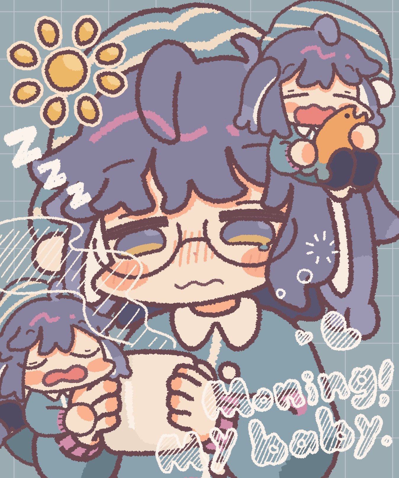 1girl black-framed_eyewear blue_eyes blue_hair blush chibi closed_mouth coffee_mug cup glasses highres hishimatope holding holding_cup long_sleeves mug open_mouth pajamas round_eyewear short_hair solo usasaki_(vrchat) vrchat wavy_mouth yawning