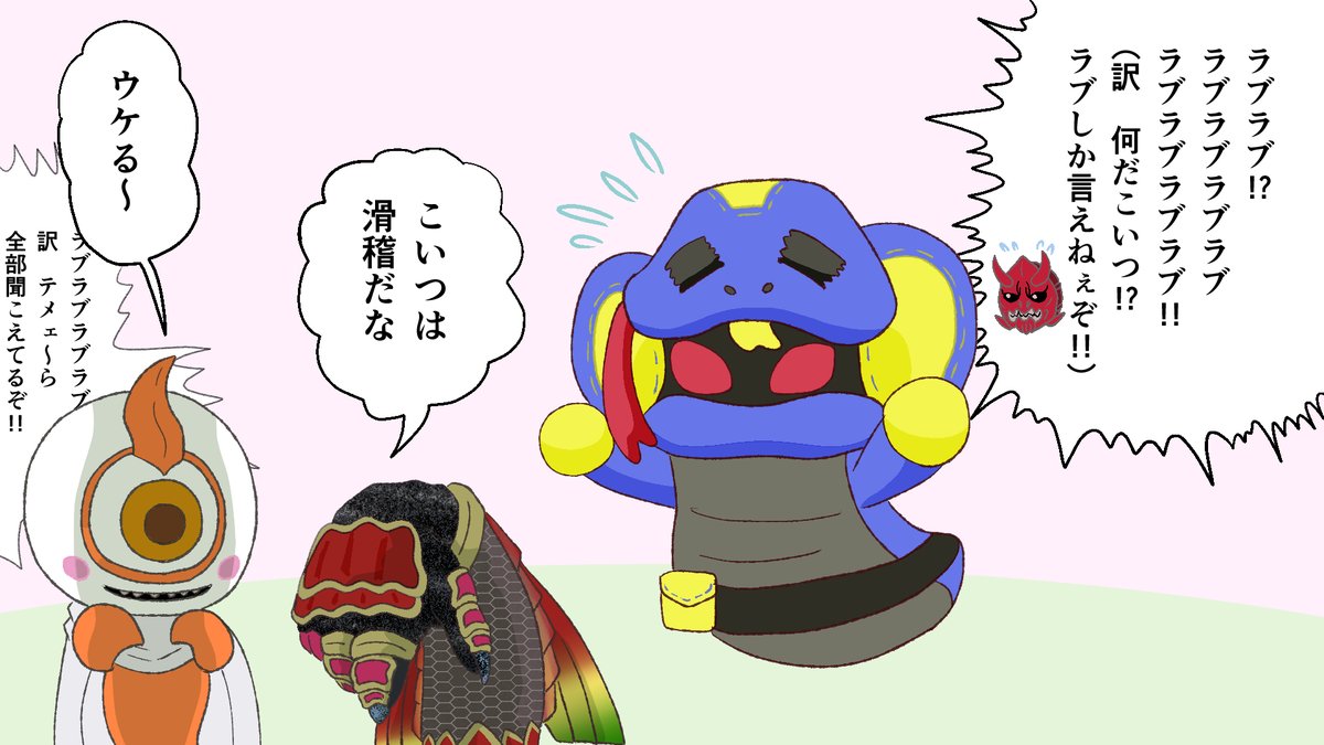 1girl 1other 2boys ankh_(ooo) bag bird cat demon demon_girl dialogue_box disembodied_hand ghost hawk japanese_text jocxgarden315 kamen_rider kamen_rider_den-o_(series) kamen_rider_ghost_(series) kamen_rider_ooo_(series) kamen_rider_revice lovekov momotaros monster_boy monster_girl multiple_boys oni panicking possessed possession red_eyes red_streaks satchel snake stuffed_toy sweat sweatdrop translated yurusen