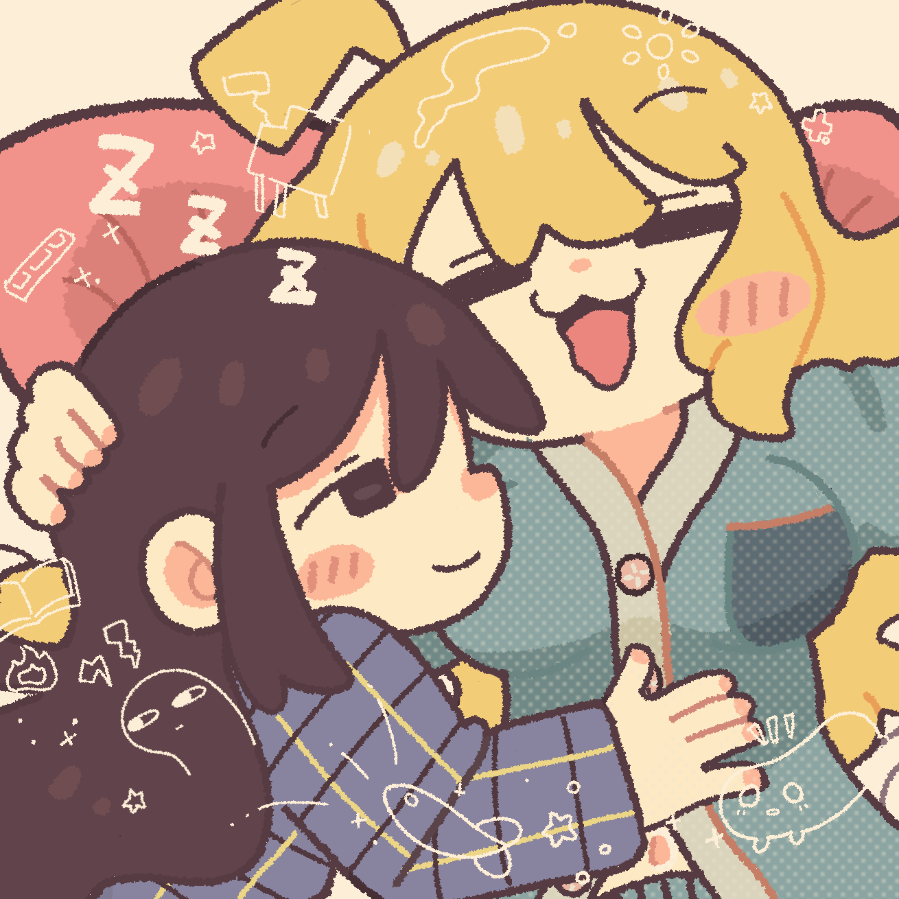 2girls :3 =_= ahoge alternate_costume black_eyes black_hair blonde_hair blush breasts chito_(shoujo_shuumatsu_ryokou) closed_mouth hair_down highres hishimatope large_breasts long_hair lying multiple_girls nuko_(shoujo_shuumatsu_ryokou) on_back open_mouth pajamas shoujo_shuumatsu_ryokou sidelocks smile yuri yuuri_(shoujo_shuumatsu_ryokou) zzz