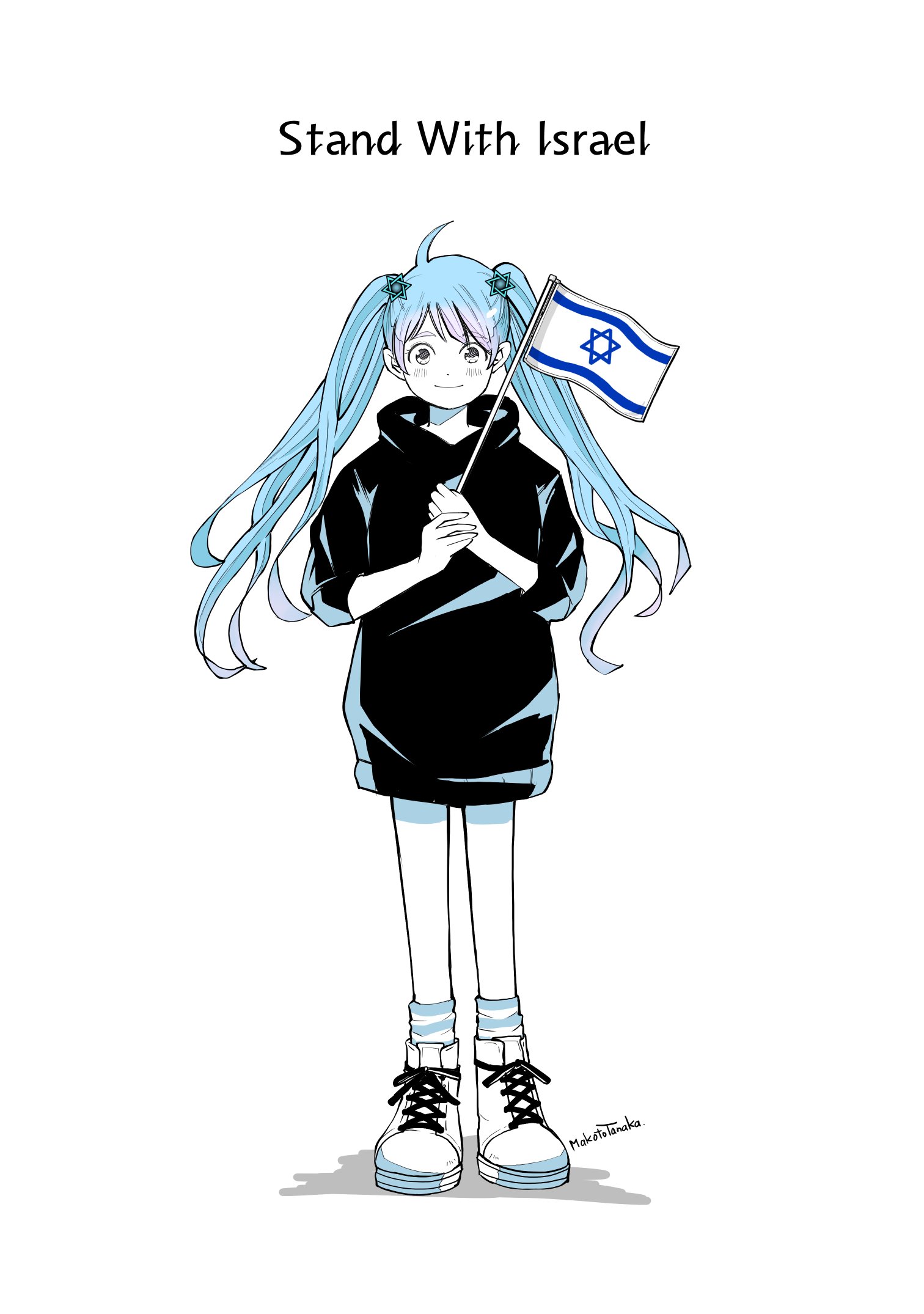 1girl ahoge ankle_socks artist_name blue_hair closed_mouth english_text flag full_body hair_ornament hashtag-only_commentary hexagram high_contrast highres holding holding_flag hood hood_down hoodie israeli_flag limited_palette long_hair looking_at_viewer original oversized_clothes own_hands_together shadow shoelaces shoes simple_background smile socks solo standing star_(symbol) star_hair_ornament star_of_david straight-on striped_clothes striped_socks swept_bangs tanaka_makoto three-quarter_sleeves twintails white_background