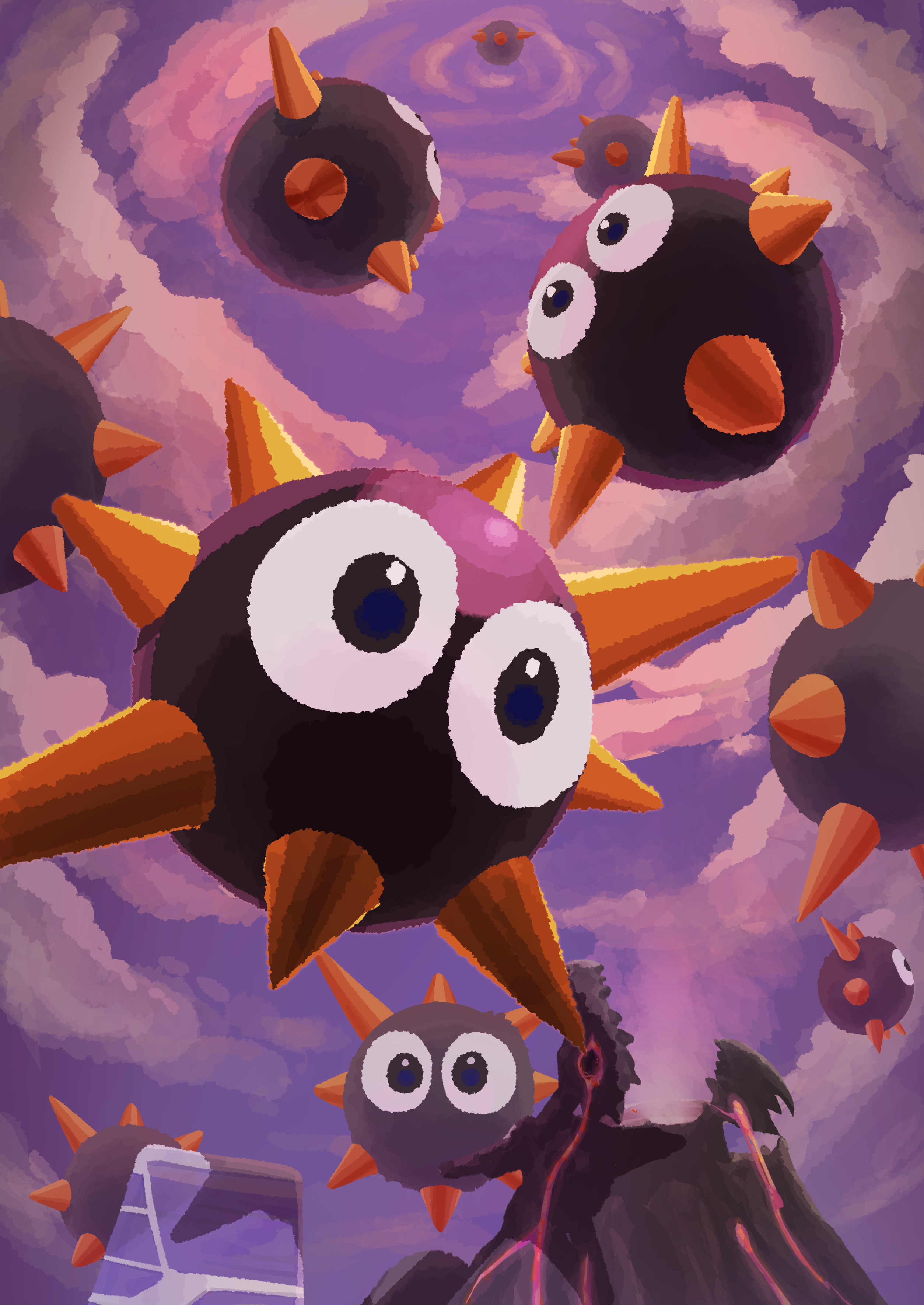 6+others absurdres cloud falling gordo highres kirby_(series) kirby_air_ride kirby_air_riders multiple_others nintendo no_humans outdoors sky spikes volcano zousui_(zousuioishii)