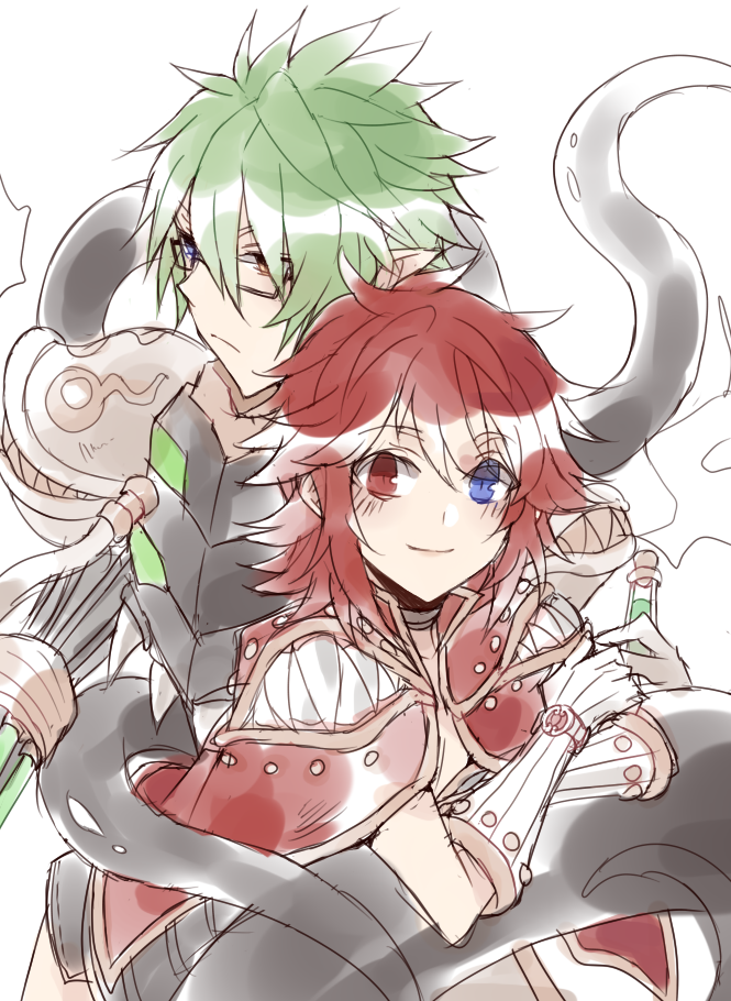 1boy 1girl armor astrarunia blue_eyes breastplate cape closed_mouth creator_(ragnarok_online) genetic_(ragnarok_online) gloves green_hair hair_between_eyes heterochromia long_bangs long_hair looking_at_viewer pauldrons pointy_ears potion ragnarok_online red_cape red_eyes short_hair shoulder_armor simple_background smile spiked_hair upper_body vial white_background white_gloves