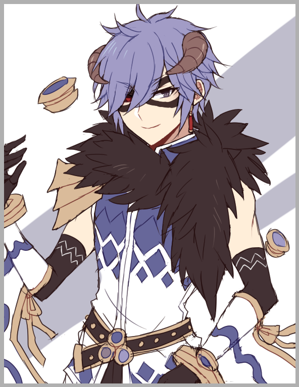 1boy 2boys argyle_clothes argyle_shirt astrarunia bangle black_gloves black_pants blue_hair border bracelet brown_horns closed_mouth detached_sleeves earrings elbow_gloves eye_mask fur_collar gloves grey_border hair_between_eyes heterochromia horns jewelry long_bangs looking_at_viewer male_focus mask multiple_boys pants purple_eyes ragnarok_online red_eyes shirt short_hair smile solo sorcerer_(ragnarok_online) upper_body white_background white_shirt white_sleeves
