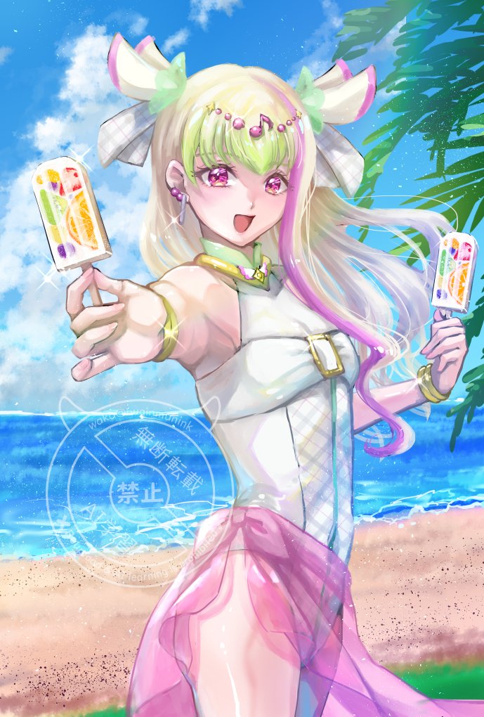 1girl armpits artist_name bare_arms bare_legs bare_shoulders beach blonde_hair blue_sky blunt_bangs bow buttons choker cloud cloudy_sky cure_zukyuun diamond_button earrings floating_hair food fortissimo fruit gradient_hair green_hair hair_bow hair_extensions hair_ornament hair_wings holding holding_food holding_ice_cream ice_cream jewelry kimi_to_idol_precure leaf long_hair multicolored_hair multiple_earrings musical_note musical_note_hair_ornament ocean one-piece_swimsuit open_mouth pearl_earrings pink_eyes pink_hair plaid_bow precure purirun_(precure) reaching reaching_towards_viewer ribbon ribbon_choker sand scarf_belt see-through_scarf sideways sky smile solo solo_focus standing summer swimsuit tanaka_purin tree twitter_username waka_(negronoir) watermark white_one-piece_swimsuit wing_hair_ornament wrist_cuffs